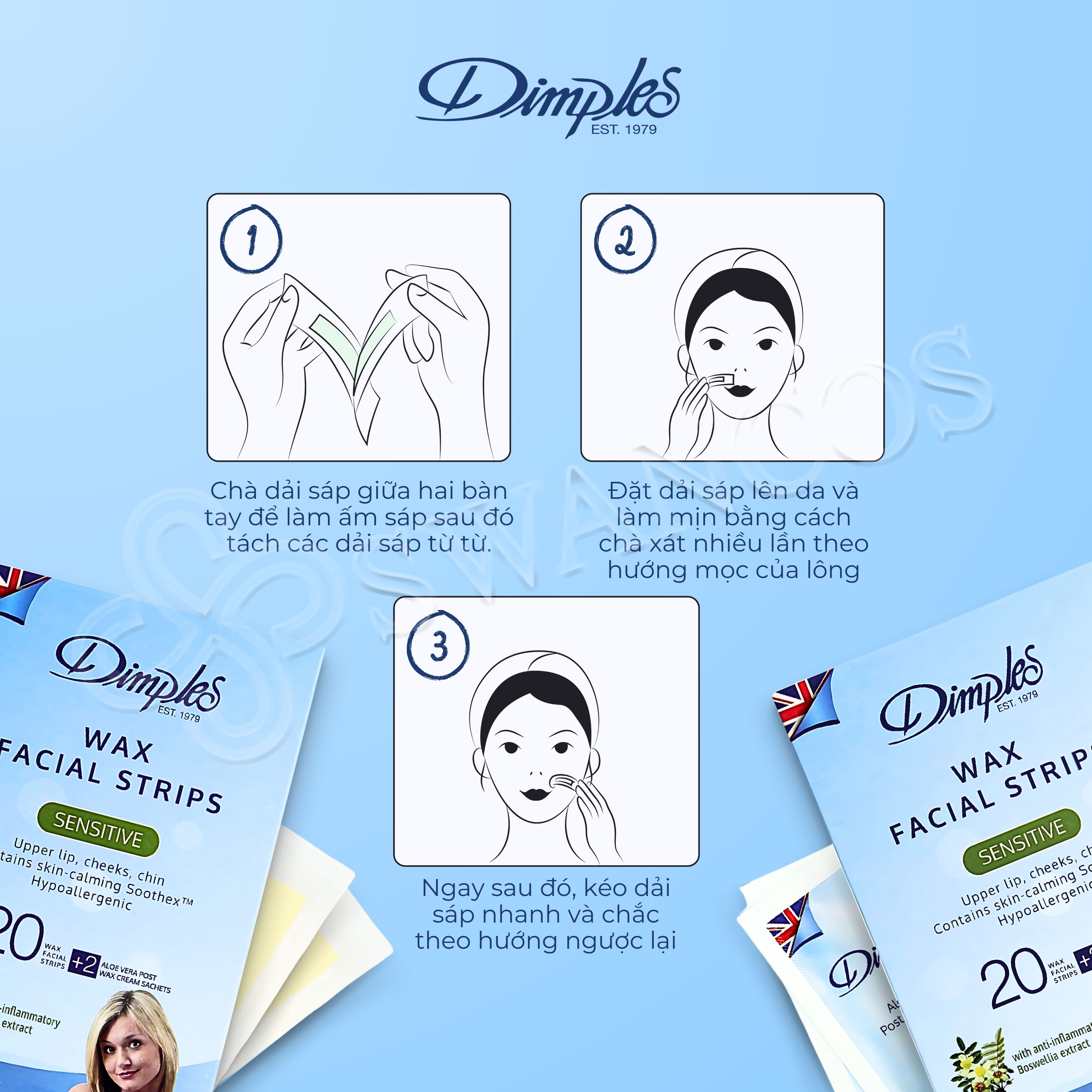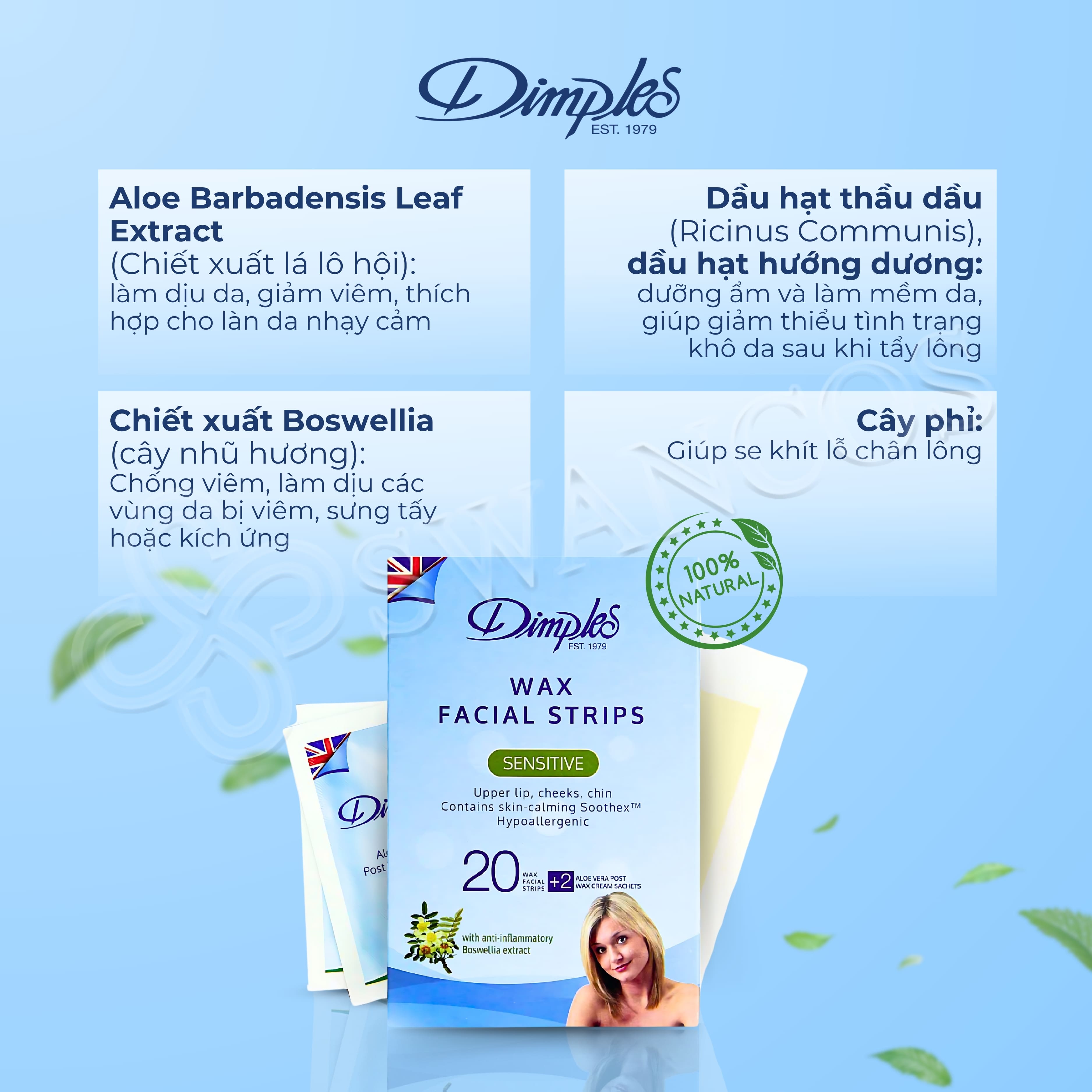 Dimples Wax Facial Strips là dòng sản phẩm chuyên biệt dành cho làn da mặt nhạy cảm, được thiết kế để loại bỏ lông không mong muốn ở các vùng như mép, cằm, má với hiệu quả rõ rệt mà vẫn đảm bảo an toàn và dịu nhẹ cho da. Sản phẩm không chứa hương liệu tổng hợp hay chất phụ gia hóa học, đã được kiểm nghiệm da liễu và chứng minh không gây dị ứng.