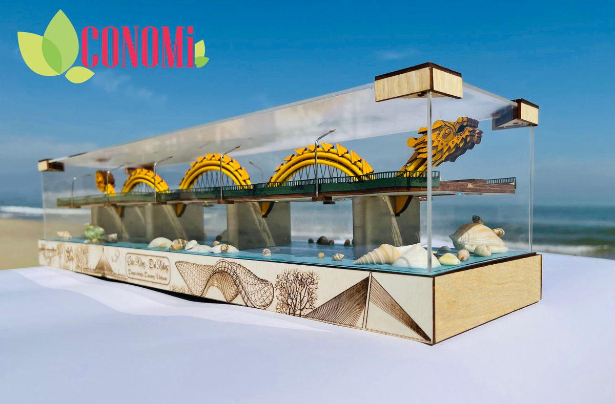 Cầu Rồng của Đà Nẵng được thu nhỏ hoàn hảo với thiết kế và chế tác công phu từ CONOMi. Chúng tôi dựa trên các chi tiết của công trình thật kết hợp với một chút biến tấu nghệ thuật để con Rồng có tạo hình đẹp mắt hơn cả cầu Rồng thật (do các yếu tố chịu lực khiến cầu Rồng thật hơi nhỏ và đầu thấp).