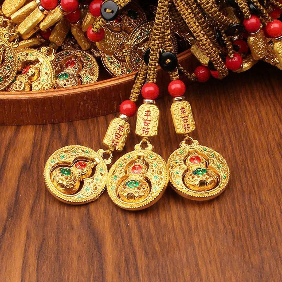 Móc treo hồ lô phong thủy vàng may mắn được thiết kế tinh xảo với họa tiết hồ lô nổi 3D, biểu tượng cho sức khỏe, bình an và tài lộc. Bề mặt được mạ vàng sang trọng kết hợp hoa văn xanh – đỏ nổi bật, tạo cảm giác cổ điển và thu hút. Phần dây treo được bện chắc chắn, điểm xuyết bằng các hạt trang trí màu đỏ, mang ý nghĩa cát tường và vượng khí.