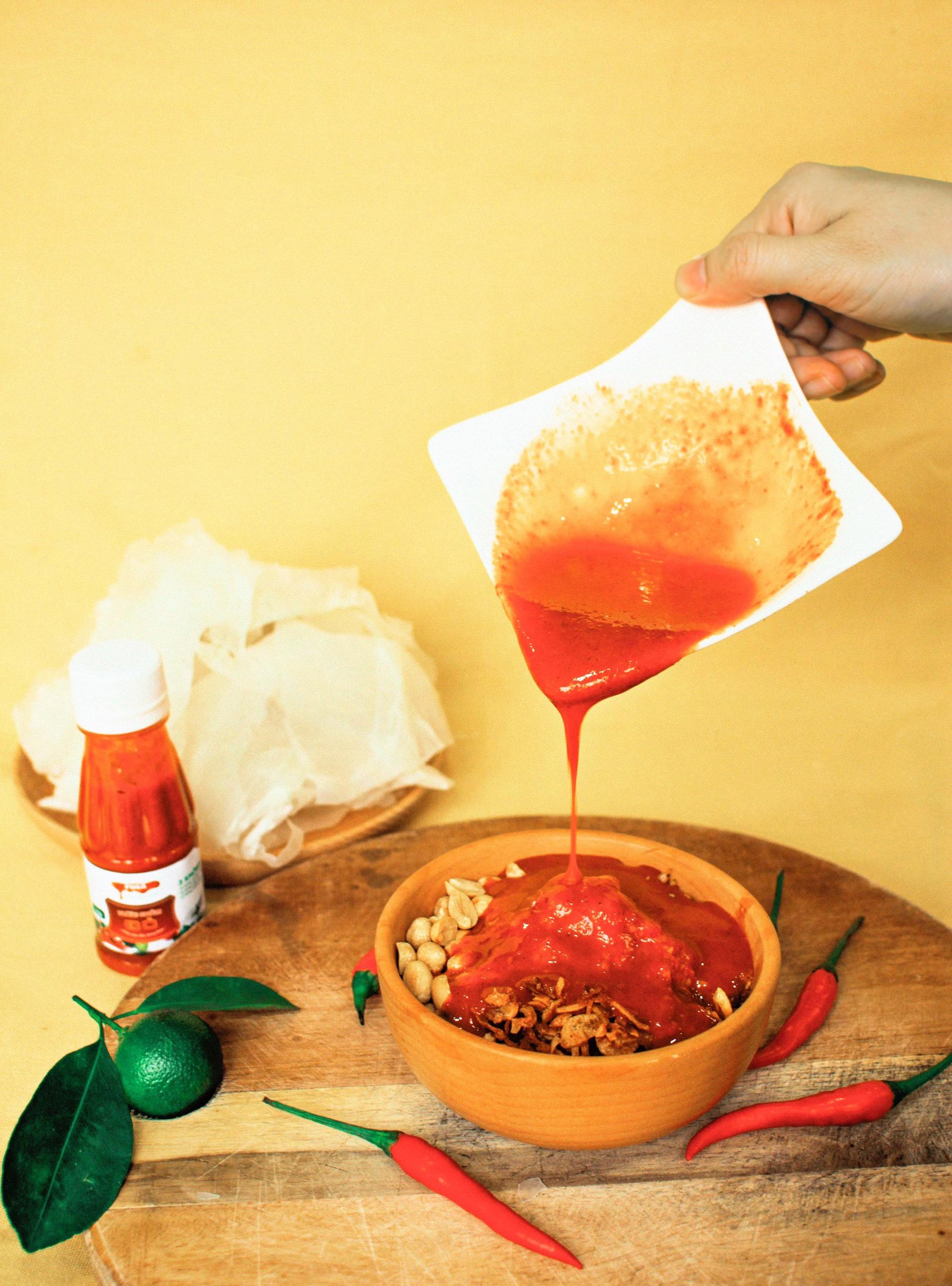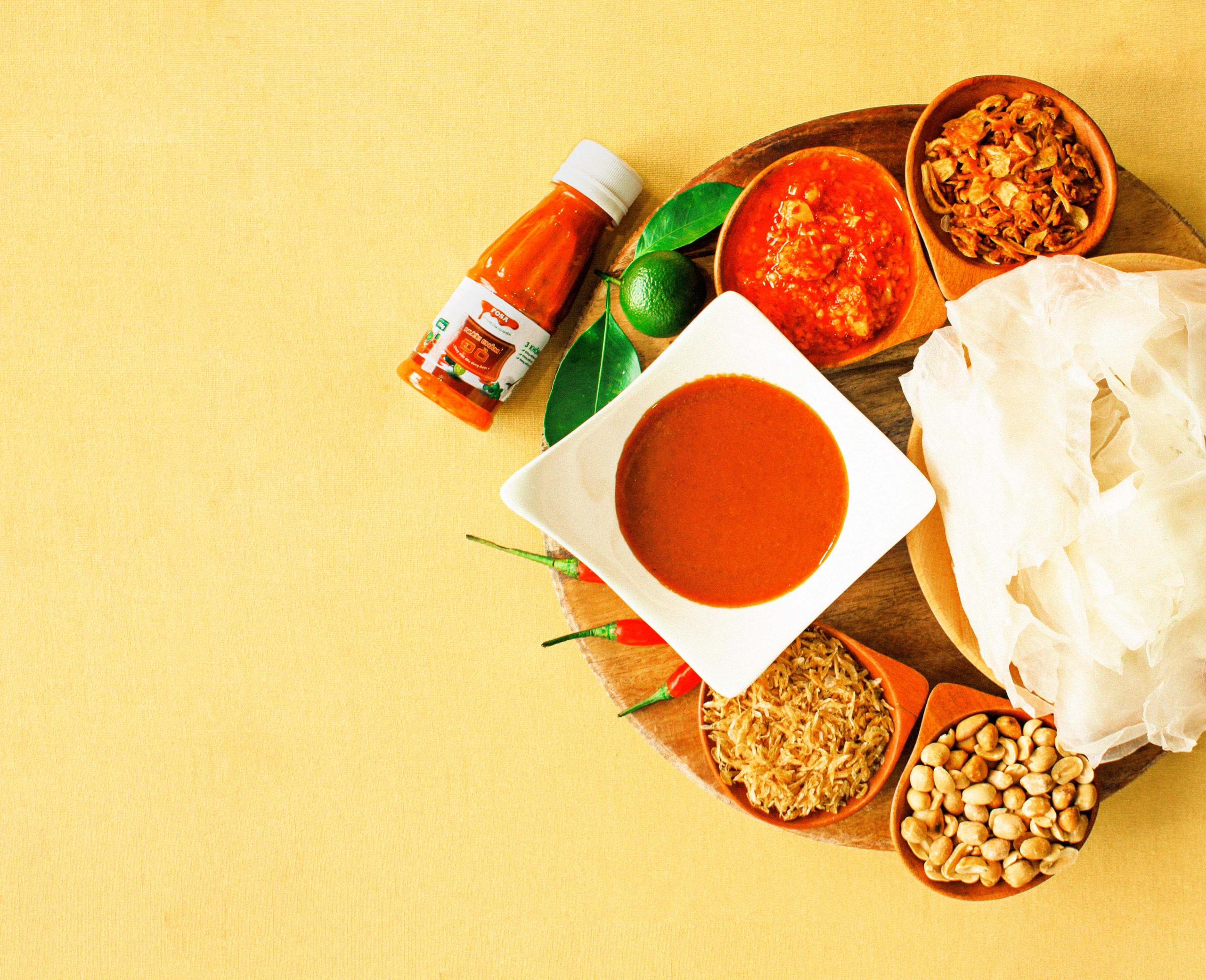 Miếng bánh tráng dẻo quệt kèm topping Đậu phộng + Ruốc + Hành phi được nấu theo công thức riêng của nhà Fosa hoà quyện chung với Nước chấm Đỏ đặc biệt thơm cay nhè nhẹ điểm thêm là vị tắc thanh thanh, kích thích vị giác quá chừng, hong biết làm sao ngưng vì càng chấm lại càng cuốnnn càng ghiềnnnnn ýh ạhhhh!