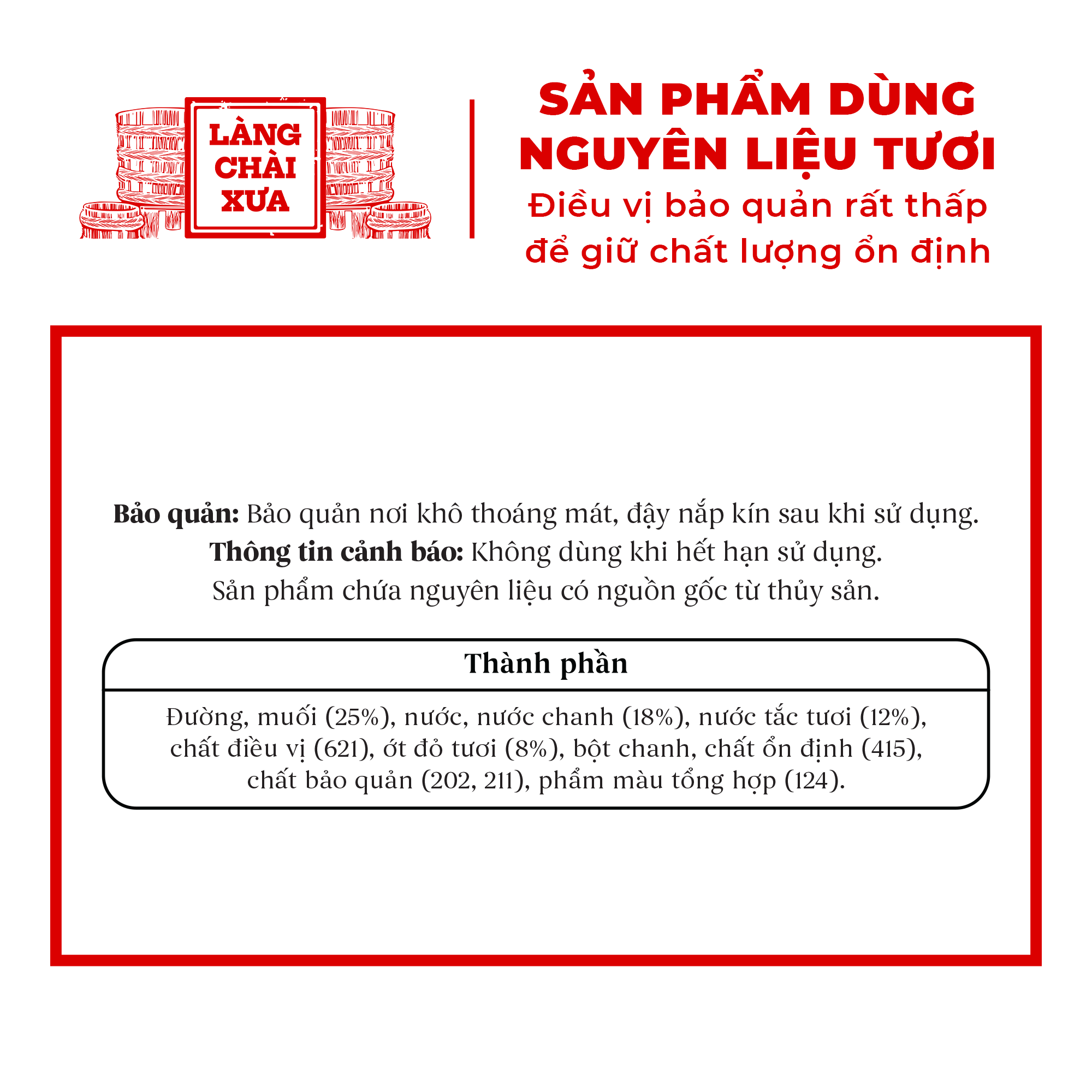Muối ớt đỏ chanh tắc Làng Chài Xưa rất thơm ngon và khác biệt, được làm công phu bằng nguyên liệu tươi. Chanh tươi, tắc tươi, ớt xiêm tươi và muối sạch tinh khiết hòa quyện nồng nàn giúp món ăn ngon hơn rất nhiều, đặc biệt là các loại thịt luộc, thịt nướng. Hãy cảm nhận hương vị thơm ngon tự nhiên!