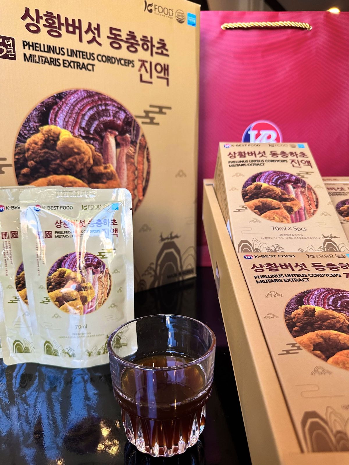 Chiết xuất hỗn hợp nấm thượng hoàng 85% (nấm linh chi, nấm thượng hoàng, đông trùng hạ thảo Militaris, nhân sâm đen, rễ cây bạch chỉ, táo đỏ, nước tinh khiết) trà mật ong, Hồng sâm cô đặc, vitamin C...