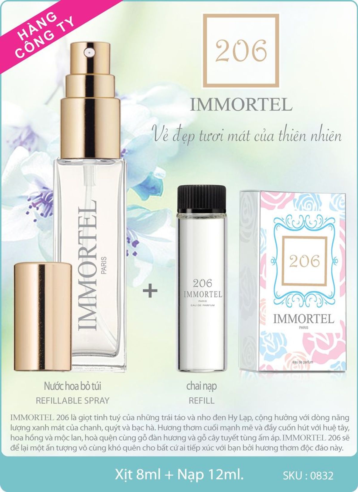 IMMORTEL 206 created with a spirit of freshness will reveal a touch of apple tree, blackcurrant combined with its energy to green citrus, mandarin and mint leaves. It finally unveils a strong personality with lity, rose and magnolia melting with sandalwood and cedarwood.