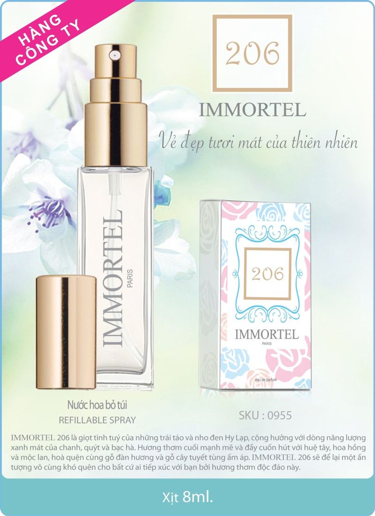 IMMORTEL 206 là giọt tinh tuý của những trái táo và nho đen Hy Lạp, cộng hưởng với dòng năng lượng xanh mát của chanh, quyét và bạc hà. Hương thơm cuối mạnh mẽ và đầy cuốn hút với huệ tây, hoa hồng và mộc lan, hoà quện cùng gỗ đàn hương và gỗ cây tuyết tùng ấm áp. IMMORTEL 206 sẽ để lại một ấn tượng vô cùng khó quên cho bất cứ ai tiếp xúc với bạn bởi hương thơm độc đáo này.