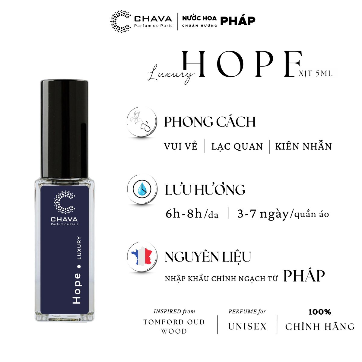 Chava Luxury Hope đại diện cho nét tinh túy của những nốt hương gỗ phương Đông phù hợp cho cả nam và nữ. Sự kết hợp hoàn hảo giữa hương vị ấm áp của gỗ và chút phóng khoáng từ cây cỏ chính là chìa khóa tạo nên sức hút của “siêu phẩm” này. Với những người thoạt nhìn có vẻ lạnh lùng nhưng thực chất lại mang một trái tim vừa mạnh mẽ vừa ấm áp thì không thể nào chối từ mùi hương của Chava Hope.
