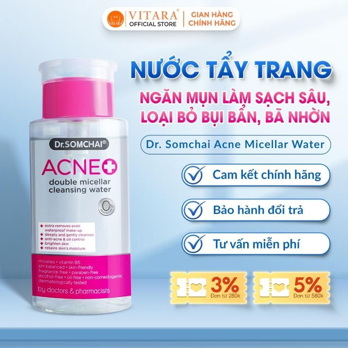 Công dụng của Nước Tẩy Trang Dr. Somchai Acne Micellar Water 200ml- Làm sạch sâu: Nhờ công nghệ Micellar, sản phẩm giúp loại bỏ hiệu quả bụi bẩn, dầu thừa và lớp trang điểm trên da, kể cả vùng mắt và môi.- Ngăn ngừa mụn: Thành phần chứa các hoạt chất kháng khuẩn và ngừa mụn, giảm thiểu tình trạng viêm nhiễm và hạn chế sự hình thành mụn.- Cân bằng độ ẩm: Không chỉ làm sạch, nước tẩy trang còn giúp duy trì độ ẩm tự nhiên, mang lại cảm giác thoáng mát và mềm mịn.- Không gây kích ứng: Sản phẩm được phát triển dành riêng cho da mụn, da nhạy cảm, không chứa cồn và các chất gây kích ứng.
