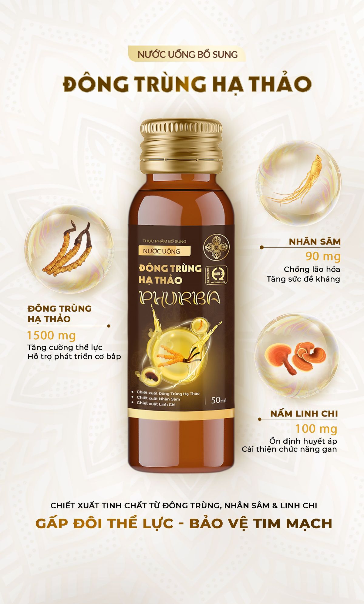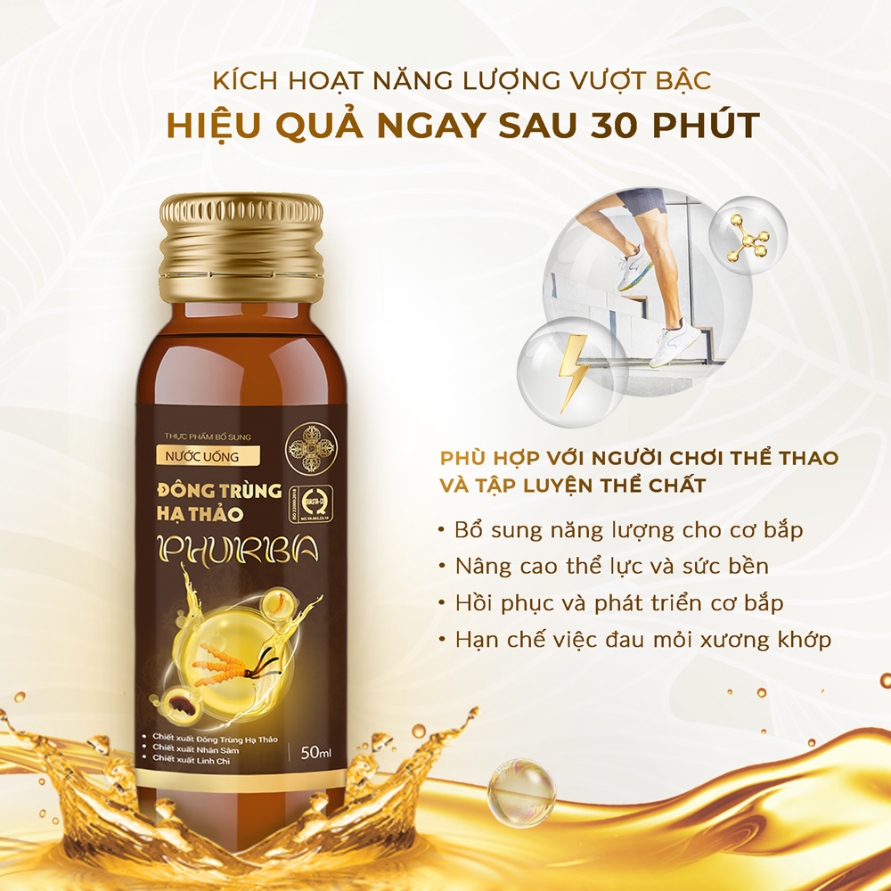 Thành phần:Thành phần cho 50ml chứa: Nước, Glycerin, Chiết xuất Đông Trùng Hạ Thảo: 1500mg, chiết xuất linh chi: 100mg, chiết xuất nhân sâm: 90mg, vitamin B1, Vitamin B6.