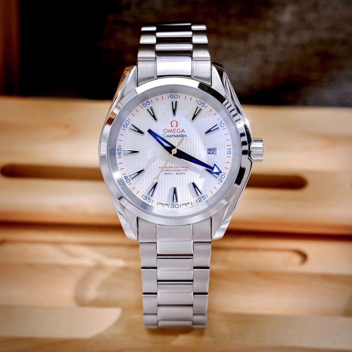 • Đồng hồ Omega Seamaster Aqua Terra mặt trắng họa tiết vân gỗ tinh tế, kim xanh nổi bật, dây thép không gỉ sáng bóng – biểu tượng của sự sang trọng và mạnh mẽ