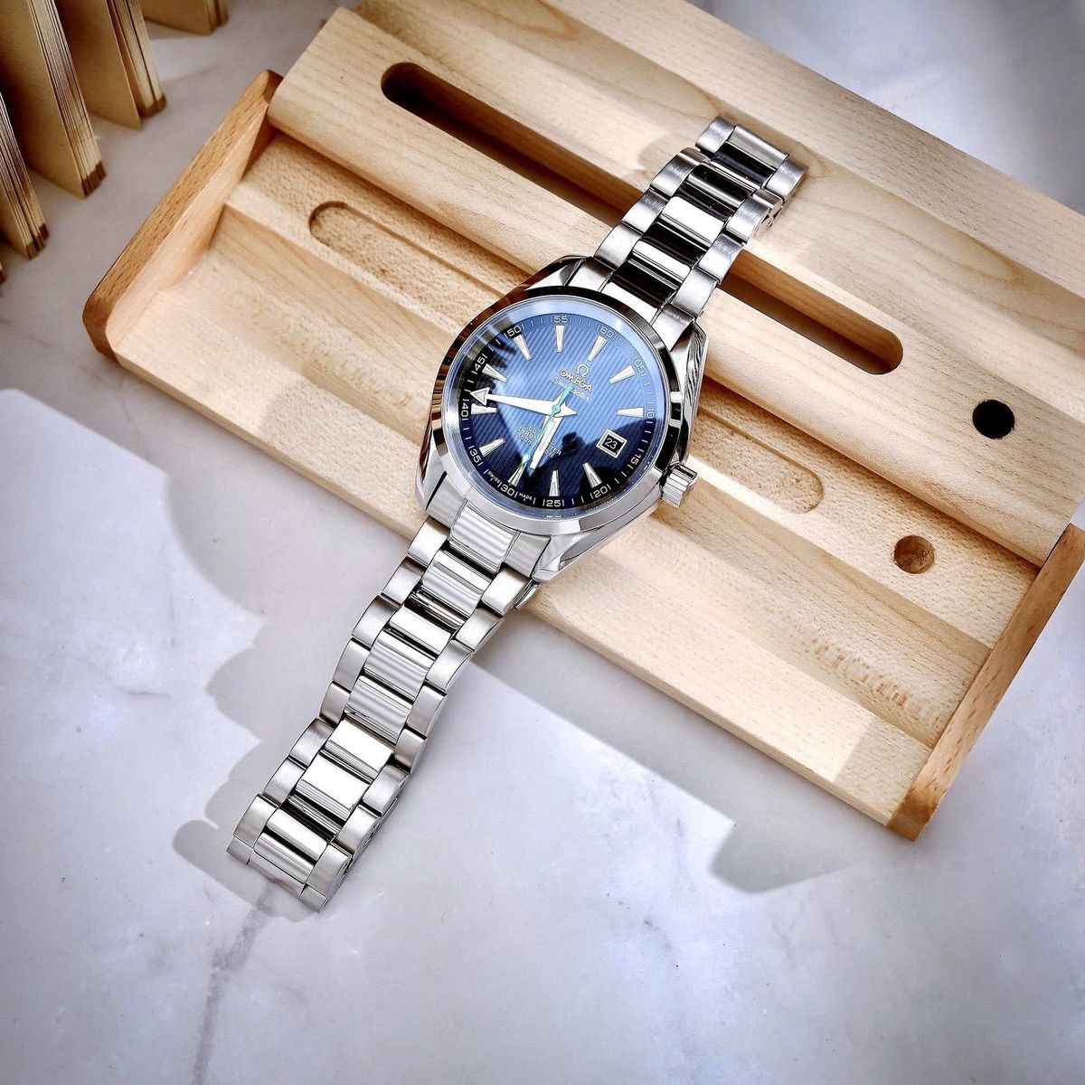 • Đồng hồ Omega Seamaster Aqua Terra mặt đen họa tiết vân gỗ tinh tế, kim xanh nổi bật, dây thép không gỉ sáng bóng – biểu tượng của sự sang trọng và mạnh mẽ.