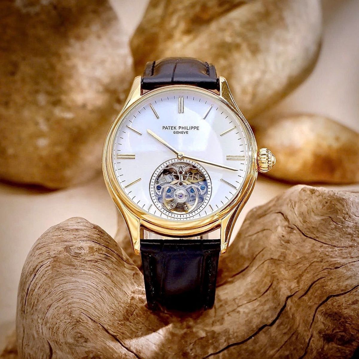 •Đồng hồ Patek Philippe mặt trắng tinh tế, khung vàng tinh xảo, lộ cơ đẳng cấp, dây da đen cao cấp – kết hợp hoàn hảo giữa nghệ thuật chế tác và phong cách quý ông hiện đại.