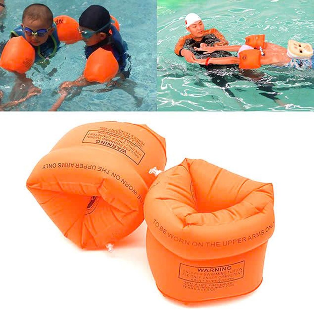 – Đeo phao vào hai cánh tay cho bé, bạn sẽ không còn phải lo sợ khi bé xuống nước mặc dù chưa biết bơi.