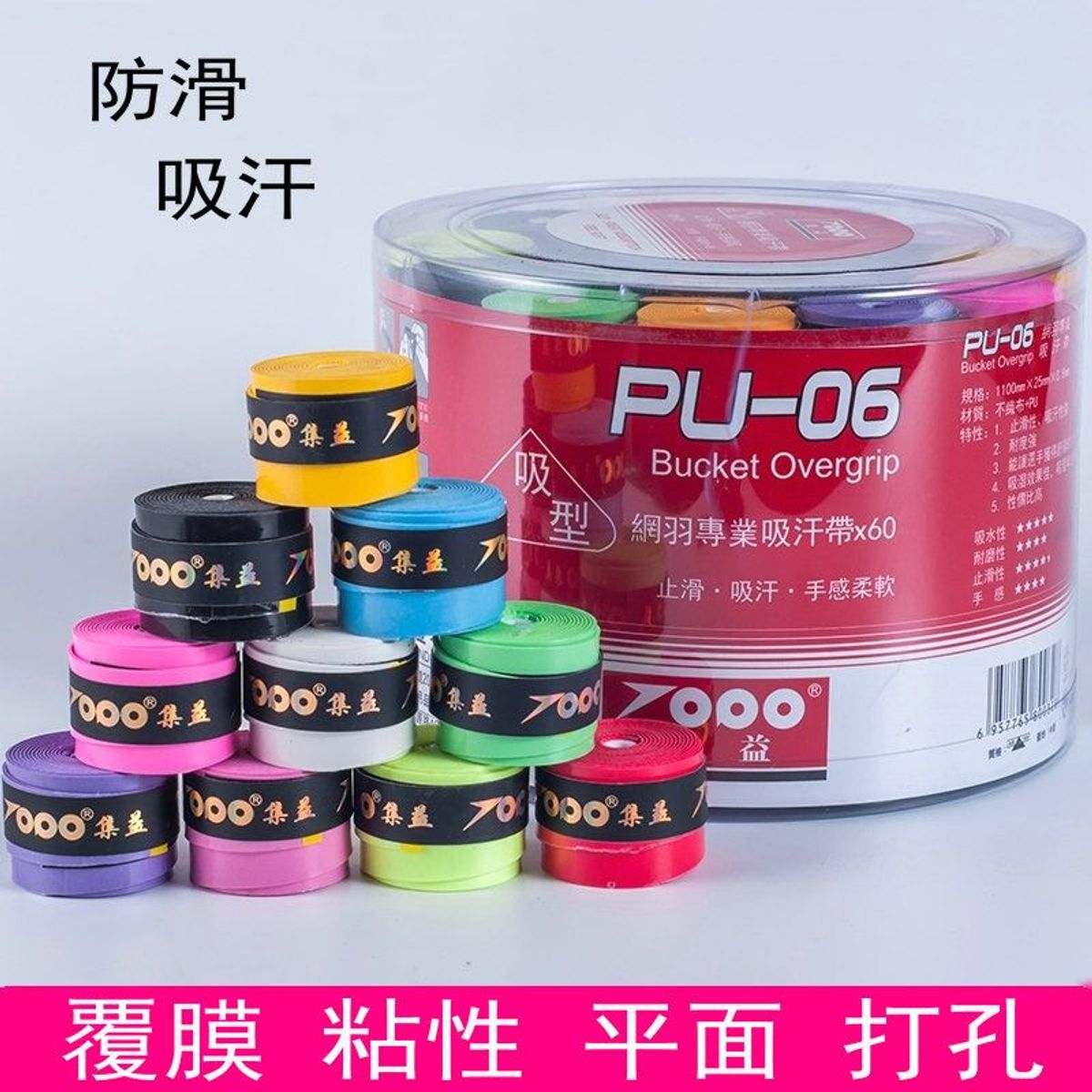 - Đặc điểm: cuốn cán mỏng với khả năng bám dính và thông khí tốt, bề mặt mịn màng, được bọc bên ngoài một lớp nylon giữ ẩm. Thích hợp cho vợt Tennis cũng như vợt cầu lông.