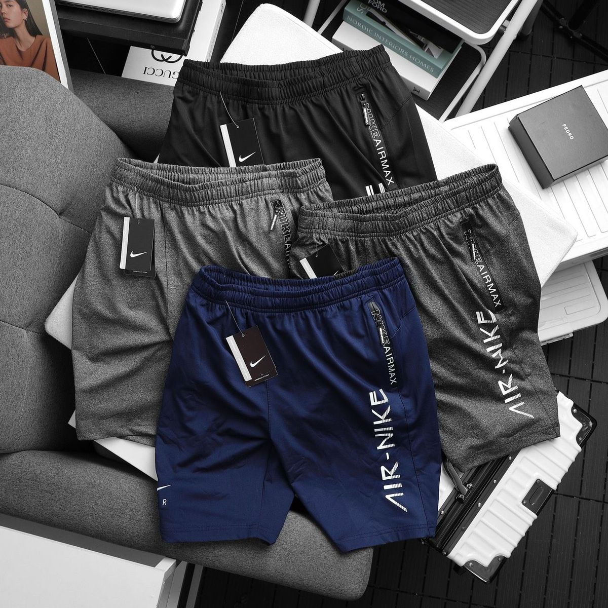 Quần đùi nam Logo Air thun poly 2 da trơn láng, co giãn 4c, 3 túi khoá kéo. Giá Sỉ,