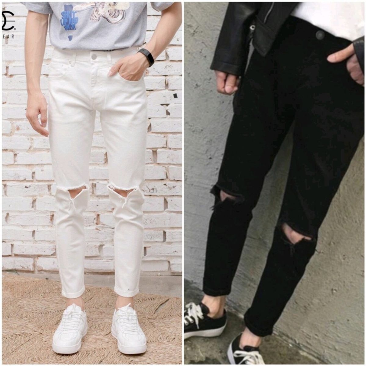 • Quần Jeans Nam Rách Gối Xẻ V Đen Trắng