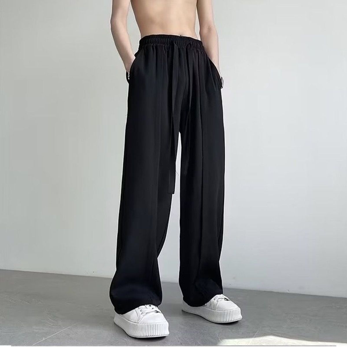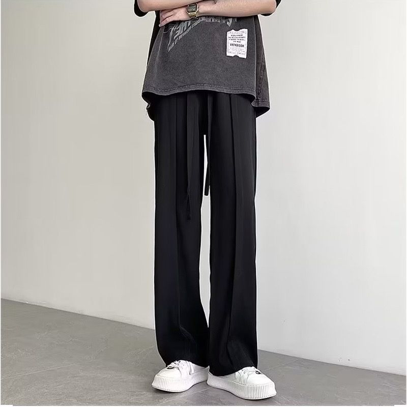 quần kaki thun form suông đen basic dập ly giữa có co giãn thoải mái,lưng thun dây bản to