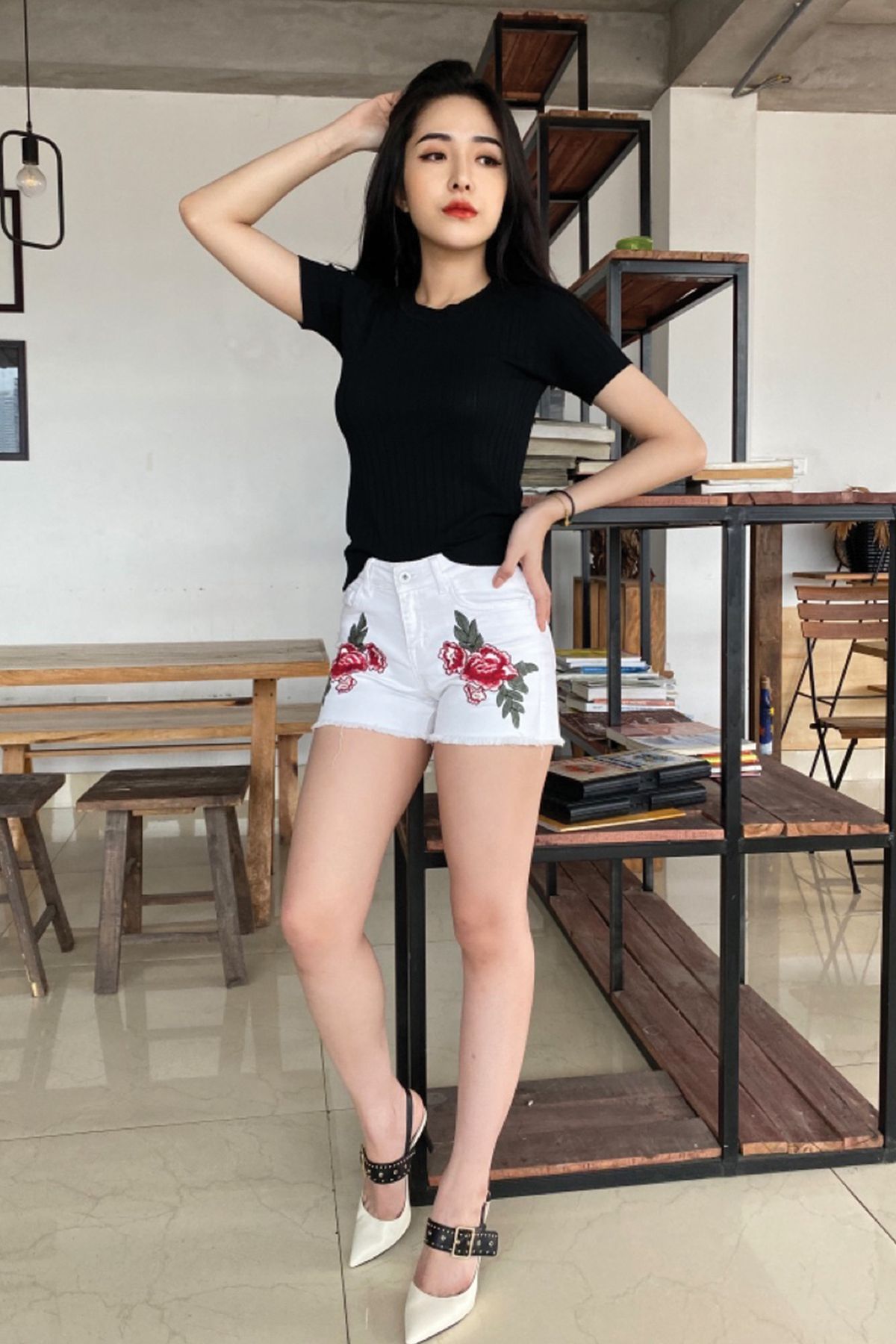 - Dáng quần: Quần short thêu bông hồng