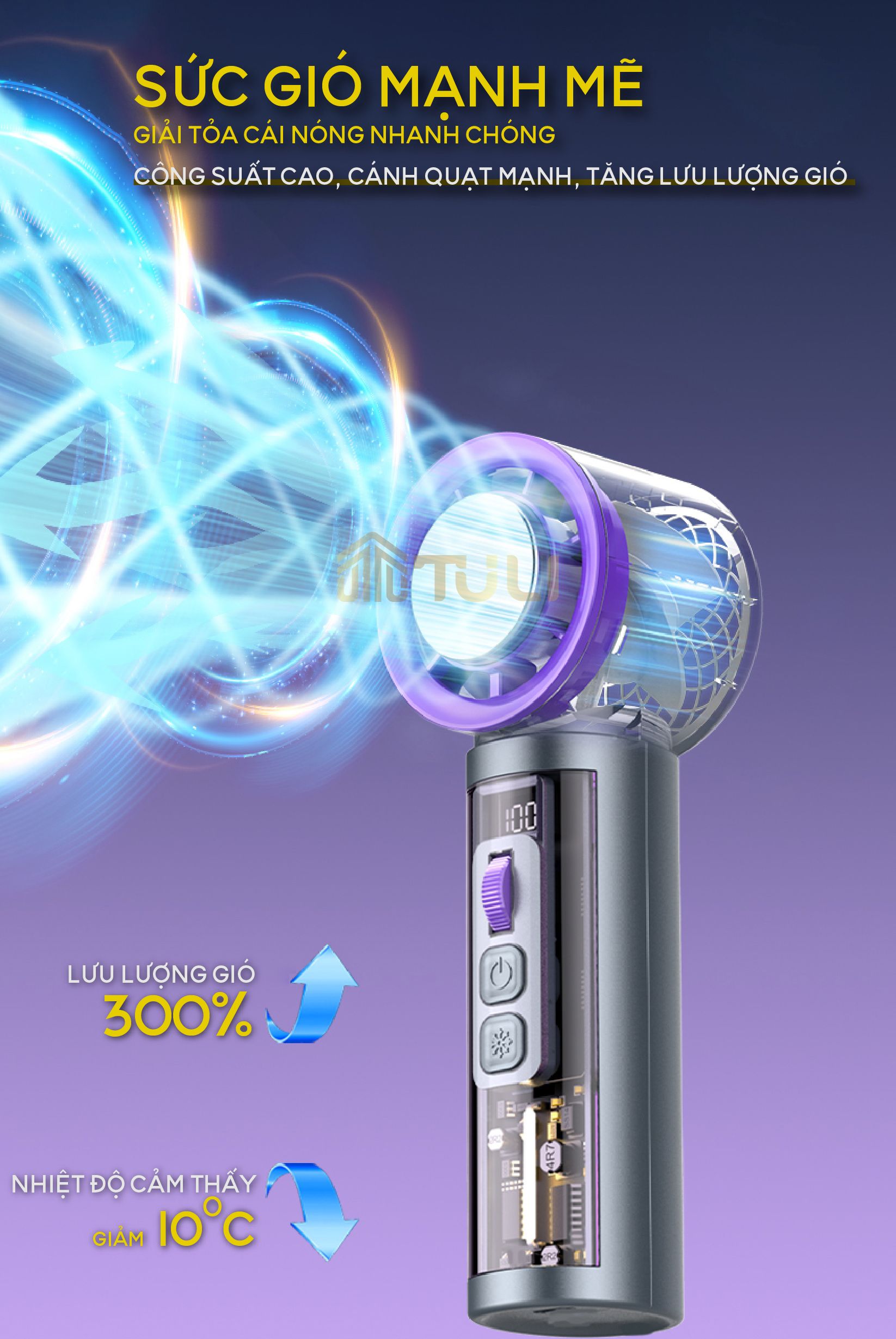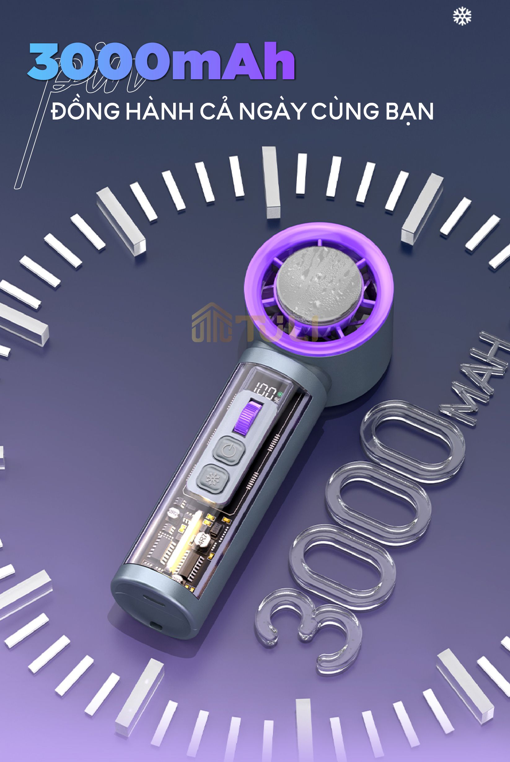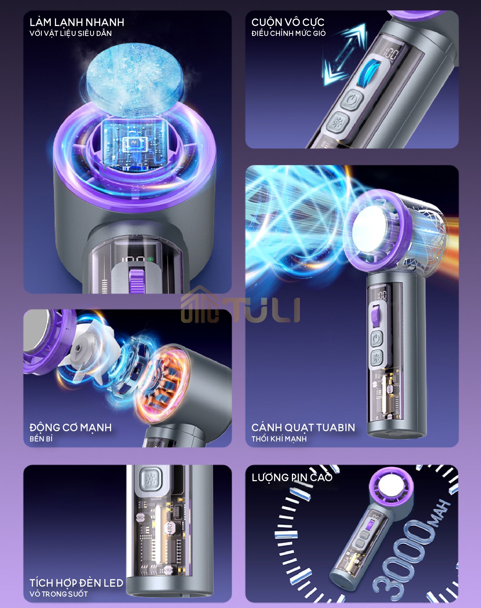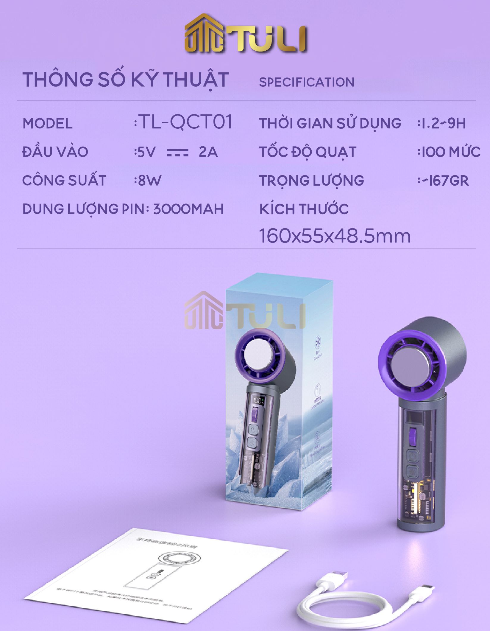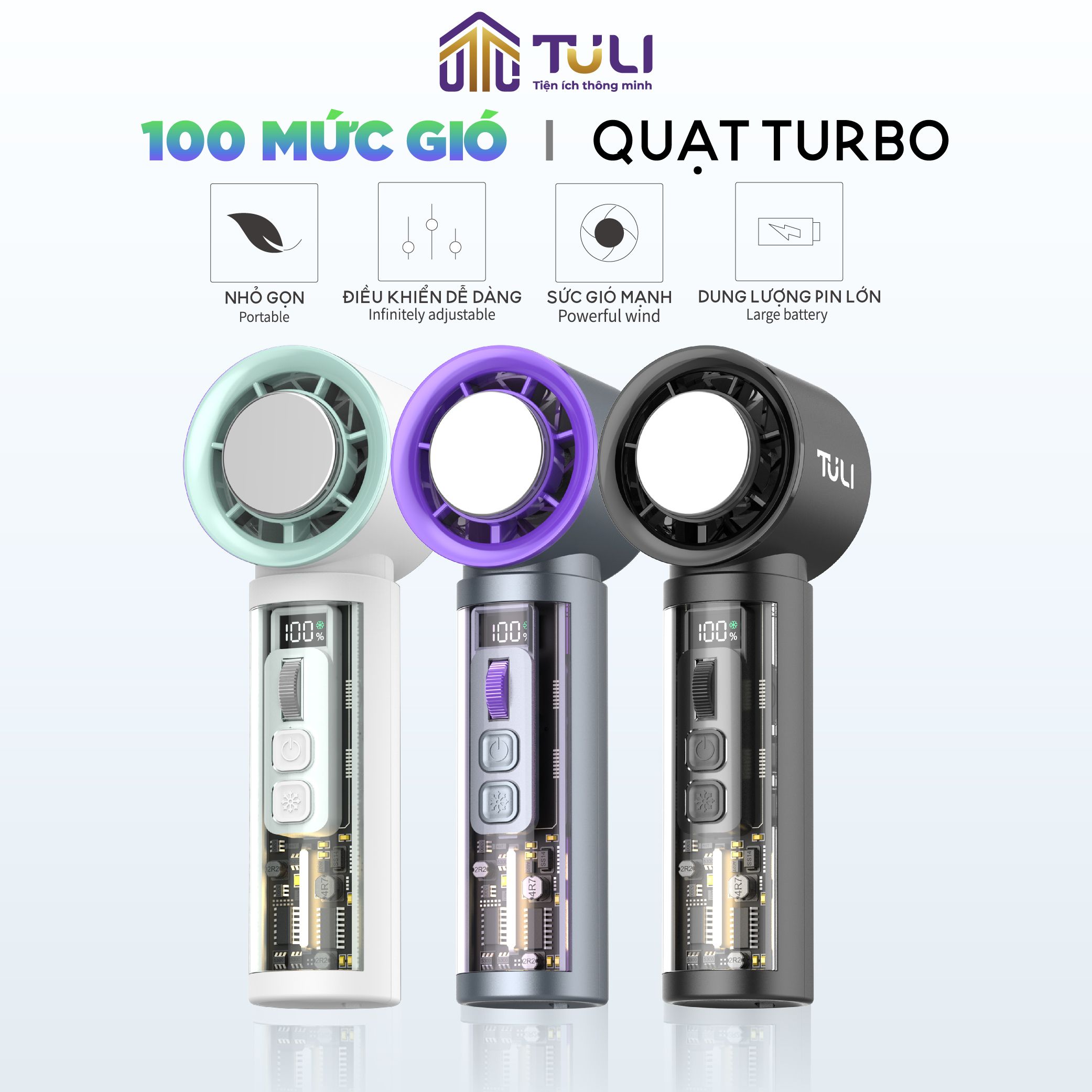 - Tên sản phẩm: Quạt Cầm Tay Mini Turbo Jet 3000mAh TULI TL-QCT01, có sò lạnh, tích điện, có thể sạc lại, BH 12tháng
