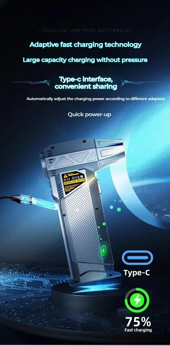 Sạc nhanh & Kích thước nhỏ gọn: Được trang bị Giao diện sạc Type-C hỗ trợ sạc nhanh ở mức 30W, máy phun bụi khí nén này có hiệu suất cực kỳ cao. Nhỏ hơn so với điện thoại thông minh trung bình, sản phẩm này cho phép sạc nhanh, đảm bảo bạn luôn sẵn sàng hành động mà không phải chờ đợi lâu.