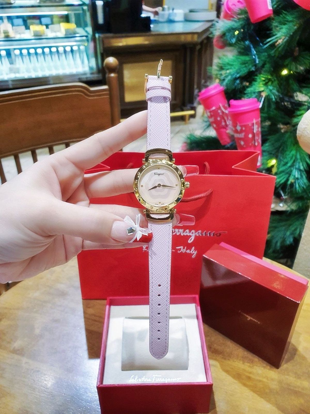 📝Đồng hồ Ferragamo nữ dây da màu hồng tượng trưng cho tình yêu. Đồng hồ Ferragamo nữ mặt tròn sáng bóng với 2 kim giờ phút và đính hạt cườm 4 góc.Họa tiết trên mặt đồng hồ gợn sóng lan tỏa giống như một bông hoa quyến rũ.