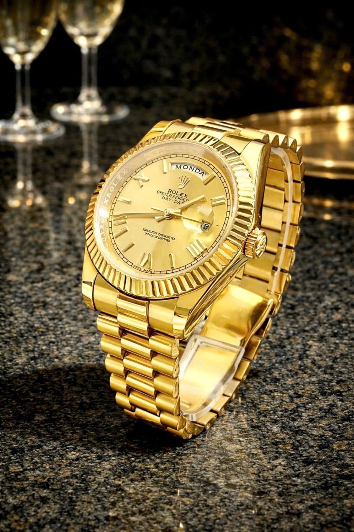 • Rolex Day-Date all gold, vỏ thép không gỉ, hiển thị ngày và thứ tiện lợi