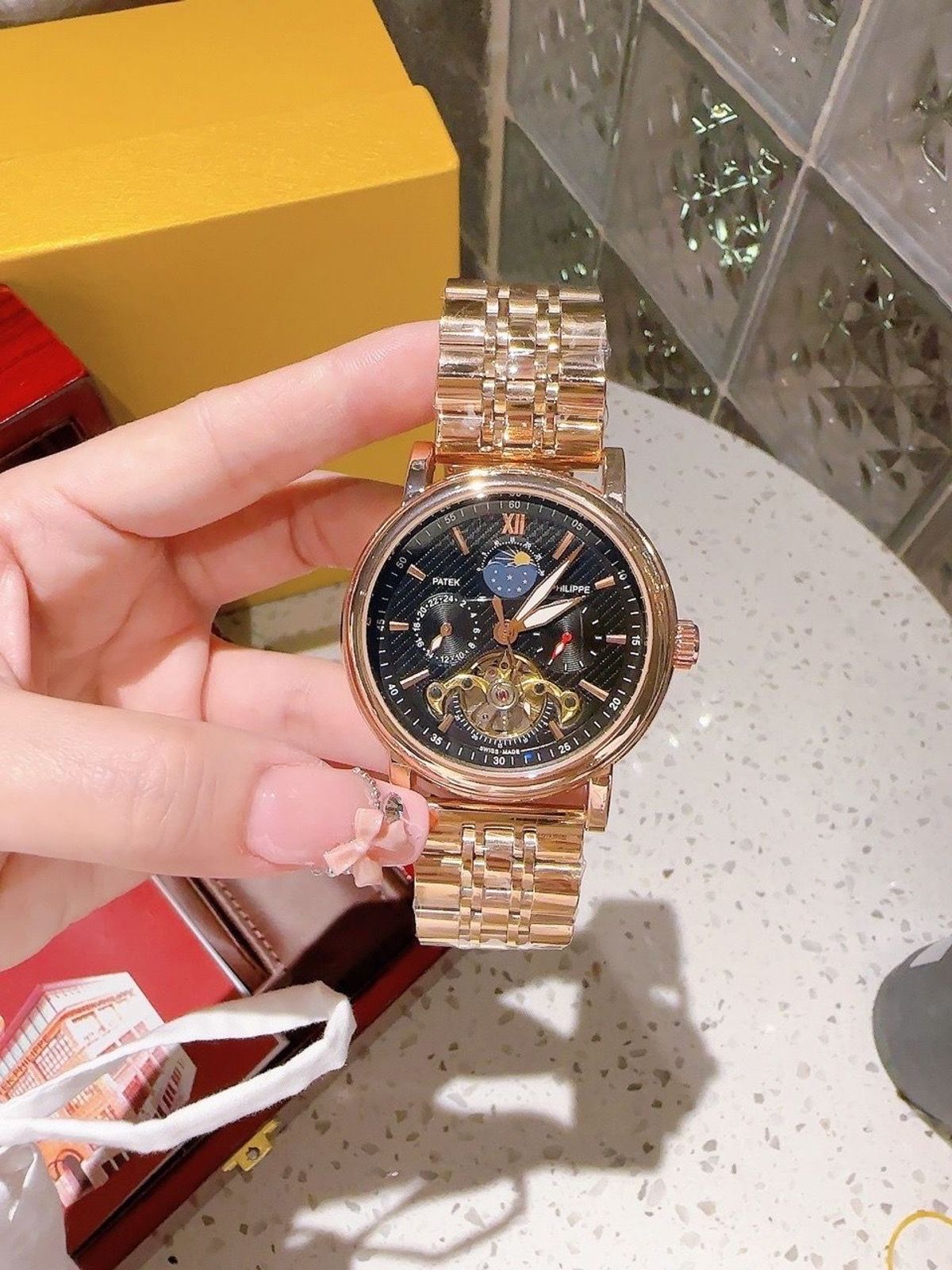 SALE BỎ MẪU CƠ TRUNG CẤP ĐỒNG GIÁ PATEK CƠ TRUNG CẤP(5283)Hàng đẹp như cao cấp , thiết kế lộ cơ độc đáo.Đường kính: 46mmDây: thép ko gỉMáy cơ tự độngSALE BỎ MẪU: Hộp :160