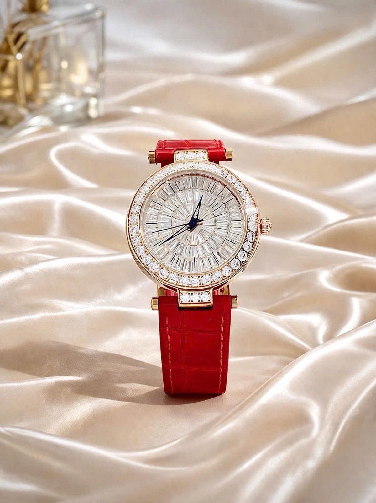 • Thiết kế mặt tròn đính đá lấp lánh kết hợp dây da cao cấp màu đỏ và đen nổi bật. Mặt số tinh xảo, kim xanh thanh lịch tạo điểm nhấn sang trọng. Phù hợp đi tiệc, gặp gỡ hoặc tôn vinh phong cách nữ tính, đẳng cấp.