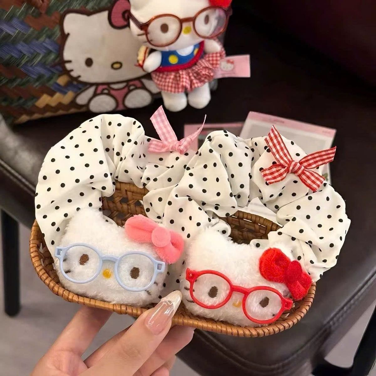 Chiếc dây buộc tóc scrunchie được thiết kế từ vải trắng chấm bi đen mềm mại, co giãn tốt, tạo độ phồng xinh xắn khi buộc tóc. Điểm nhấn đặc biệt là một mascot thú bông nhỏ đáng yêu, đeo kính đỏ và nơ đỏ nổi bật, giúp món phụ kiện trở nên độc đáo và thu hút hơn.