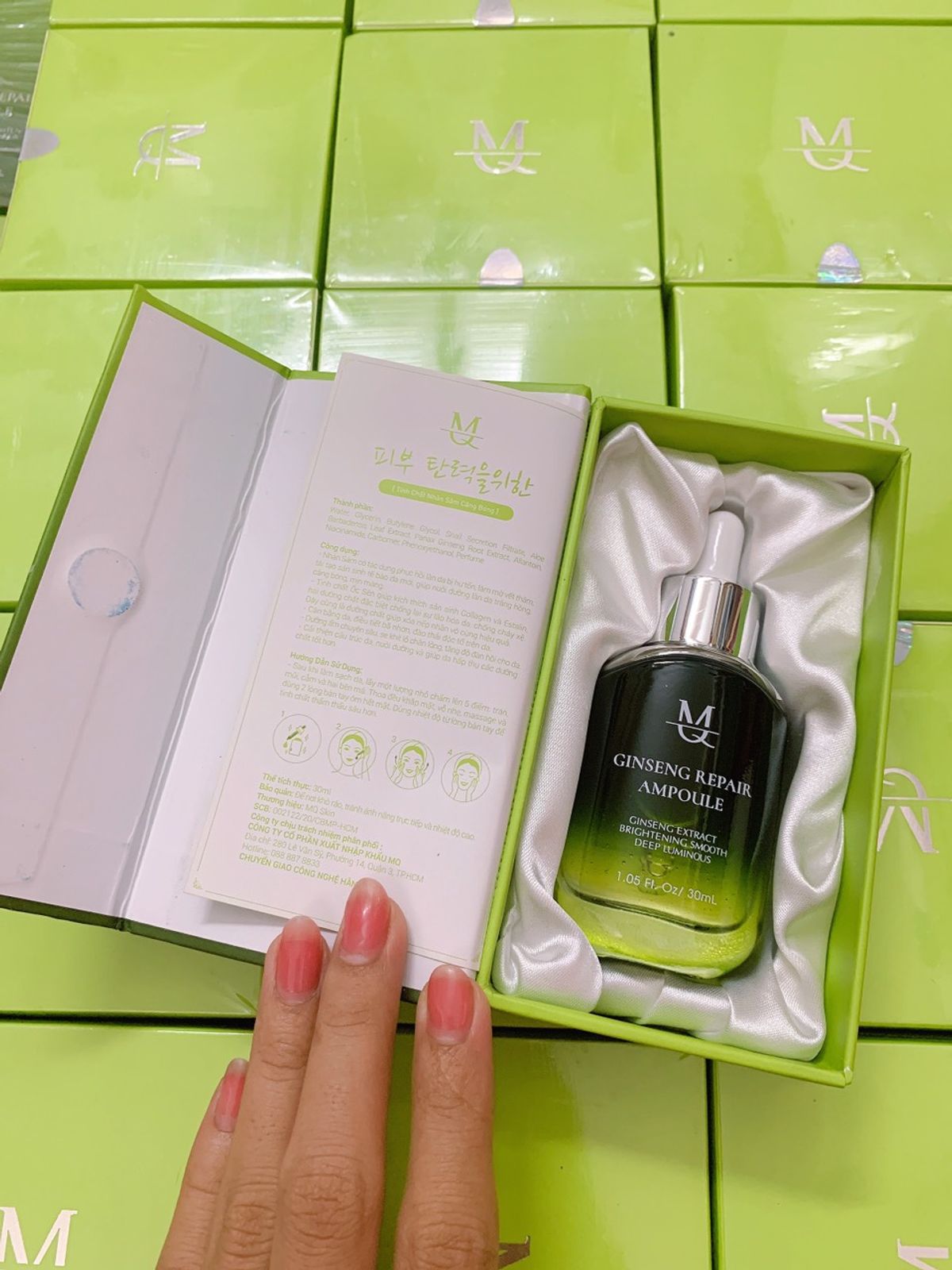 Serum Căng Bóng Da Nhân Sâm MQ Skin hay có tên gọi đầy đủ là Huyết Thanh Nhân Sâm Tái Tạo Da. Chiết xuất từ nhân sâm đỏ củng cố nền da bằng hoạt động chống oxy hóa và tang cường miễn dịch giúp làn da căng bóng, dưỡng sáng da và se khít lỗ chân long. Serum Căng Bóng Da Nhân Sâm MQ Skin giúp tăng sinh collagen, tăng độ ẩm của da, tăng kết cấu của da, tăng giữ nước cho da,thúc đẩy trao đổi chất cho da, tạo độ căng bóng kéo dài. Về tổng thể giúp tái cấu trúc toàn bộ da, làn da được phục hồi khỏe mạnh, chống chịu với môi trường tốt hơn. Màu sắc da trong sáng, bóng và đồng đều màu sắc hơn, lỗ chân lông được thu nhỏ, các sẹo nhỏ Nếp nhăn nhỏ mờ và biến mất. Với những trường hợp da khô độ ẩm được cải thiện rõ rệt ngay từ lần đầu tiên. Da nhạy cảm làn da được phục hồi hàng rào da da khỏe mạnh hơn và ít bị các yếu tố bên ngoài kích thích. Da sử dụng kem trộn thì đây là phương pháp phục hồi mạnh mẽ nhất, hiệu quả nhanh, khôi phục lại cấu trúc và độ dày da khi sử dụng kem trộn kéo dài. Cách sử dụng: Bước 1: Làm sạch da Bước 2: Bẻ ống Serum Căng Bóng Da Nhân Sâm MQ Skin theo hướng dẫn Bước 3: Lấy 1-2 giọt huyết thanh chấm lên 5 điểm: trán, mũi, cằm và hai má. Sau đó xoa đều và massage nhẹ nhàng cho huyết thanh thấm vào da. Có thể dung ngày 2 lần sáng và tối. Bảo quản: Nơi khô ráo hoặc ngăn mát tủ lạnh, tránh ánh nắng trực tiếp và nhiệt độ cao, tránh xa tầm tay trẻ em