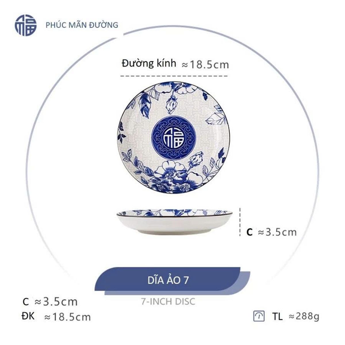 SET 10 ĐĨA SỨ ẢO HOA XANH CHỮ PHÚC 18CM