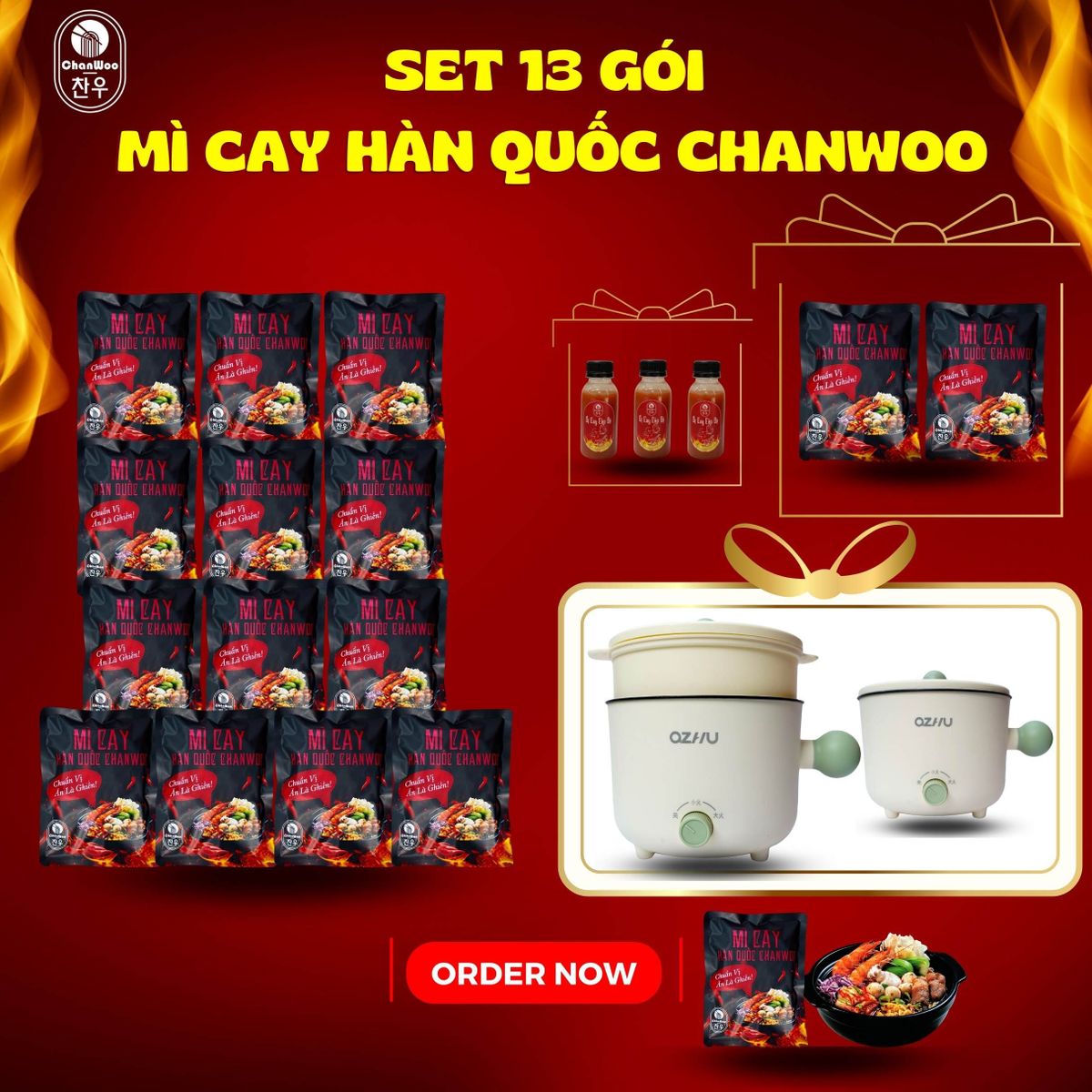 Set 13 Gói Mì Cay Chanwoo Phiên Bản Mới - (Tặng 1 Nồi Điện Hai Tầng 189K + 2 Gói Mì Cay 56K + 3 chai cấp độ)