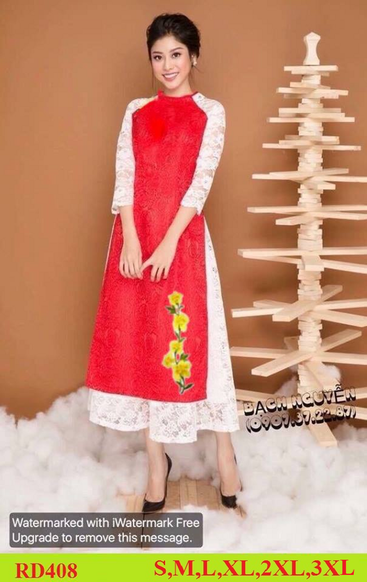 SET ÁO DÀI LỤA TAY REN THÊU LAN KÈM CHÂN VÁY REN