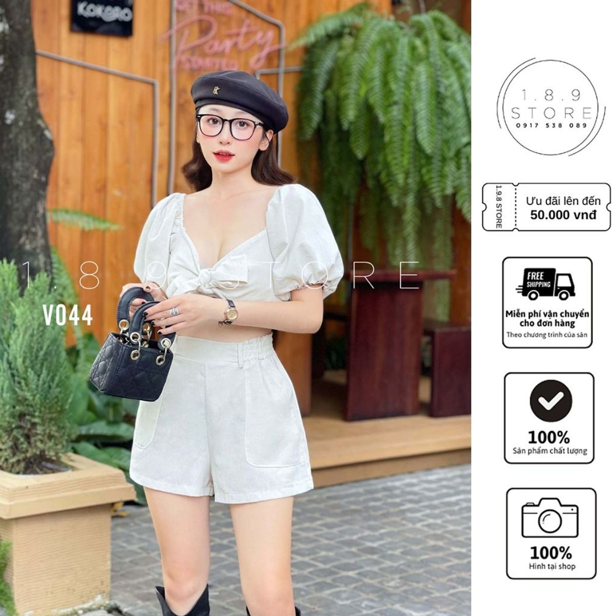 Set Áo Đi Biển Crop Top Nude Thắt Nơ Mix Quần Short Cạp Chun