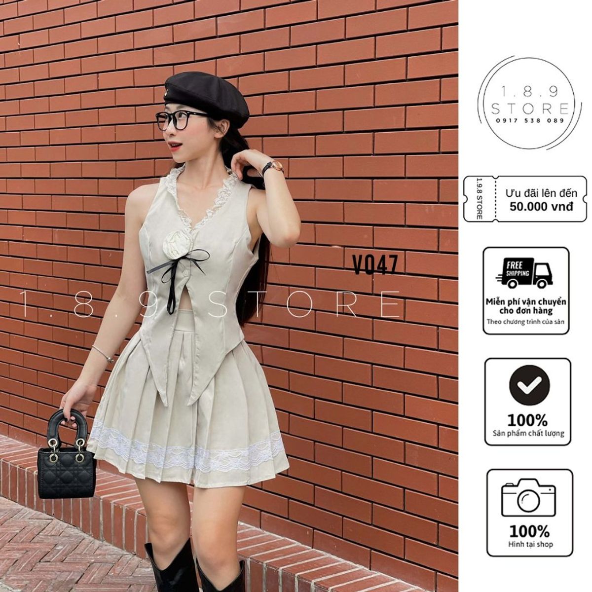 Set Áo Gile Phối Cúc Dây Hoa Viền Ren Mix Chân Váy Xếp Ly Siêu Sang Chảnh