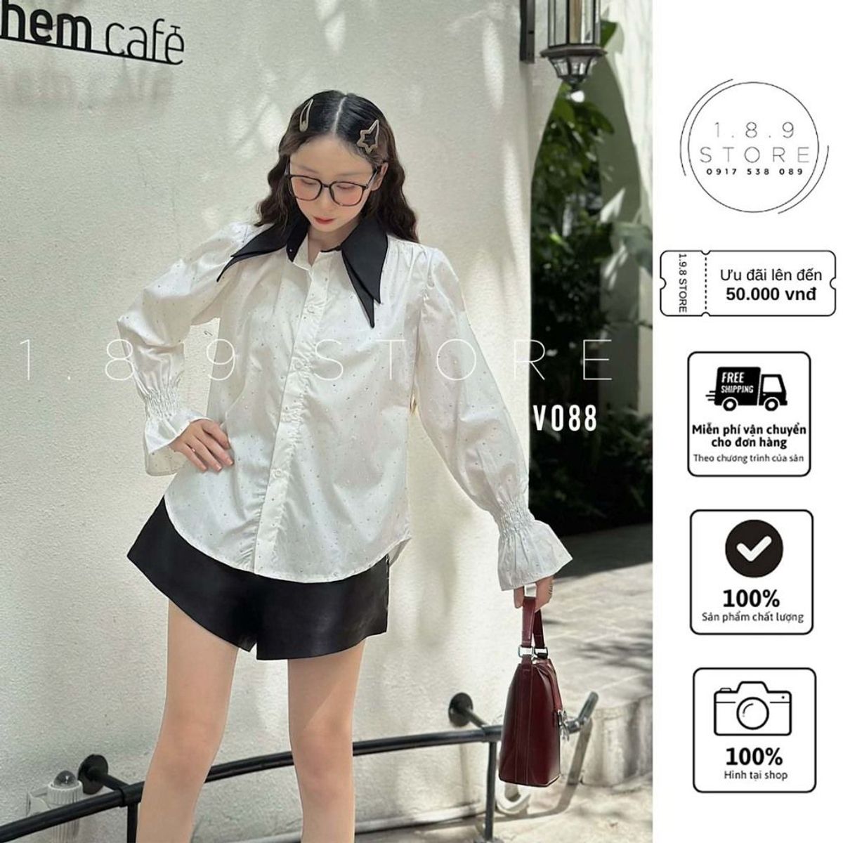 Set Áo Sơ Mi Nữ Trắng Đính Đá Dài Tay Phối Cổ Đen Tay Chun Phom Rộng, Áo Kiểu Sơmi Kiểu Dáng