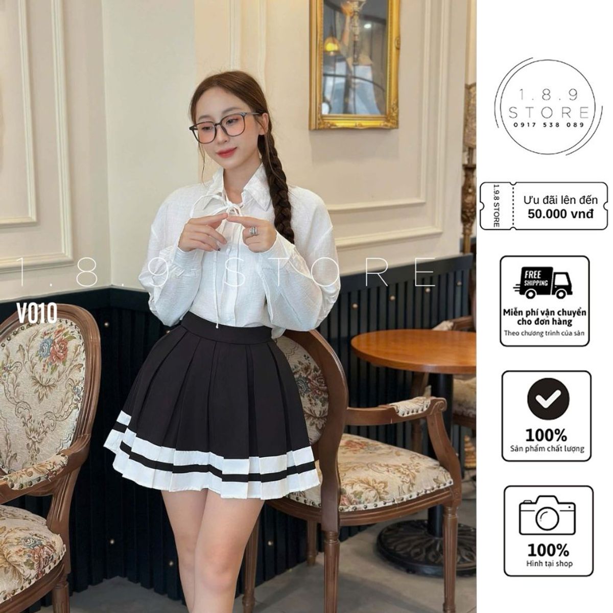 Set Áo Sơ Mi Mix Chân Váy Xếp Ly Viền, Cổ Điển, Thanh Lịch Chất Liệu Vải Thô Mịn, Mát - 189 STORE-V010
