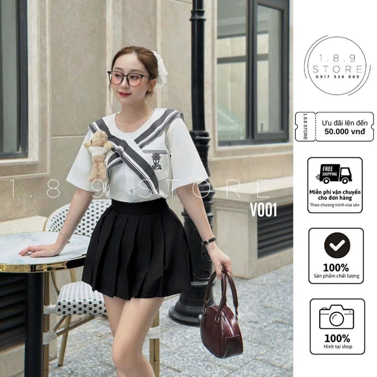 Set Áo Sơ Mi Thô Cổ Thuỷ Thủ Cài Gấu Kèm Chân Váy Xếp Ly