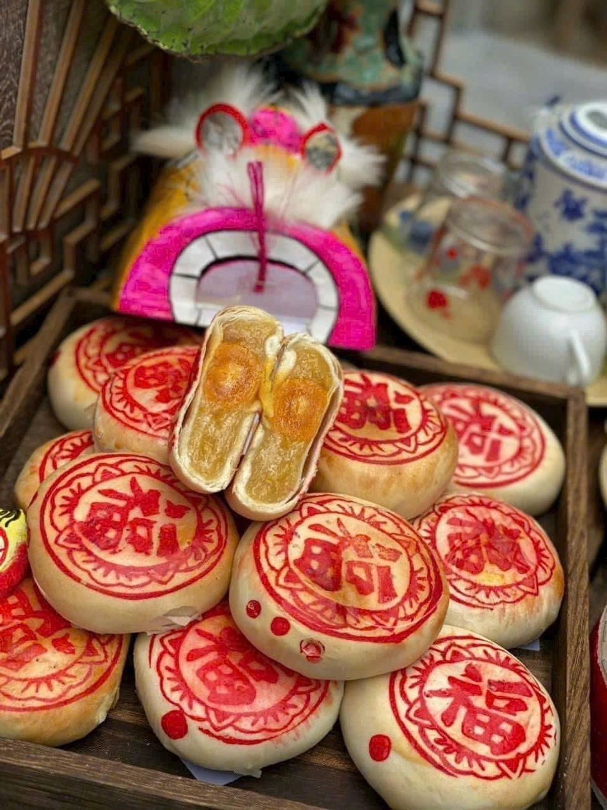 💛 Vỏ pía nhiều lớp nướng truyền thống – giòn rụm bên ngoài, mềm dẻo bên trong.