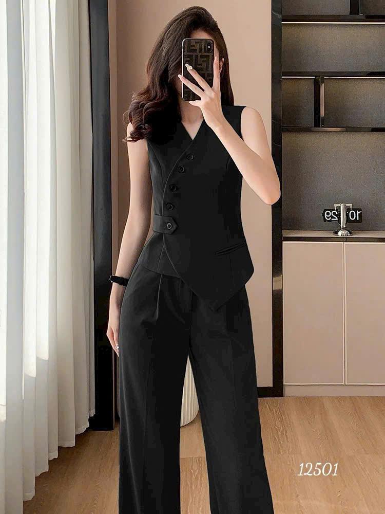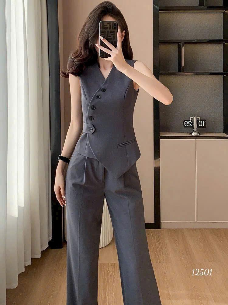 Set công sở áo sát nách cúc chéo, quần âu dáng suông, chất liệu cotton lạnh mềm mại, thiết kế cao cấp, bộ công sở- HN77