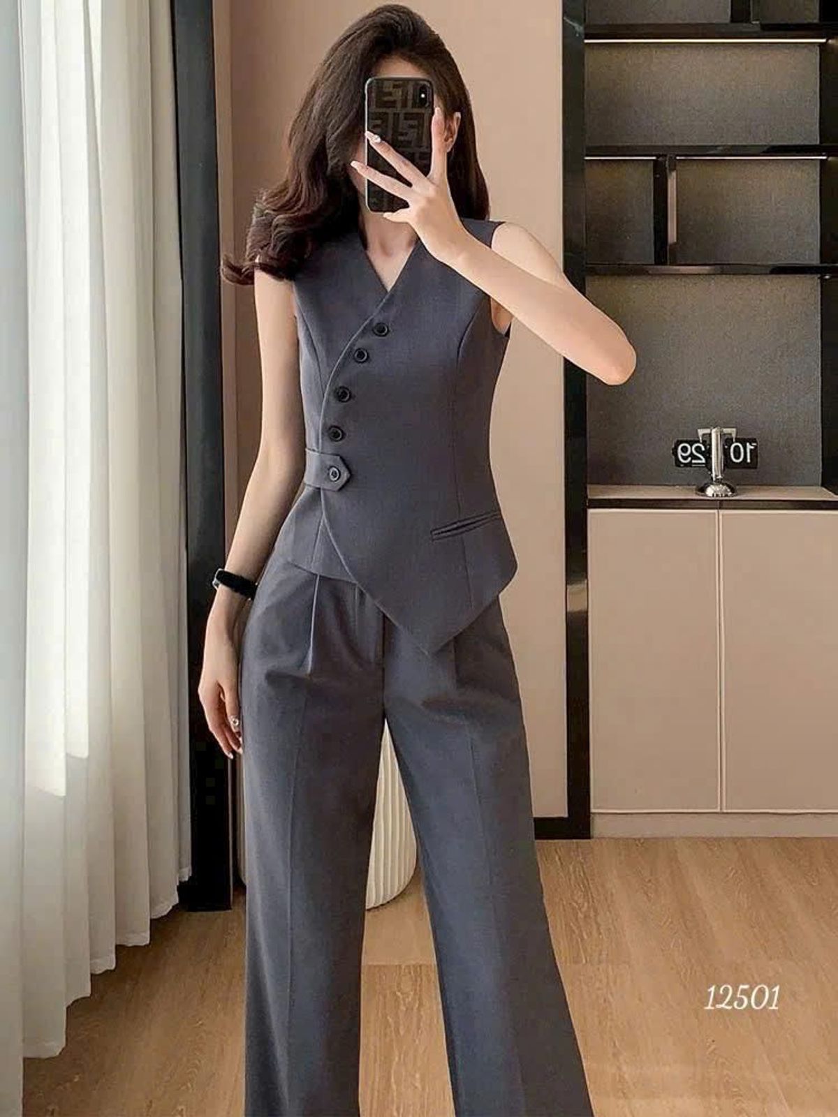 chất liệu: cotton lạnh. Nguyên set gồm 1 áo gile cổ V gài nút, full lót áo lụa thân trước lẫn thân sau dày dặn + 1 quần suông lưng cao, ống suông dài nhíu eo tôn dáng, có túi 2 bên.