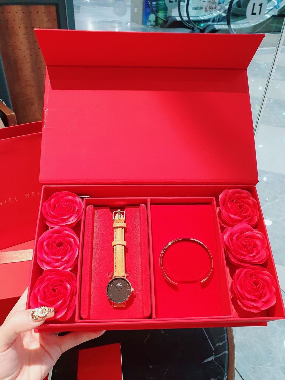 🌹Set quà gồm: Đồng hồ dây da petite mặt tròn + Cuff tay và hộp hoa hồng đỏ sang trọng