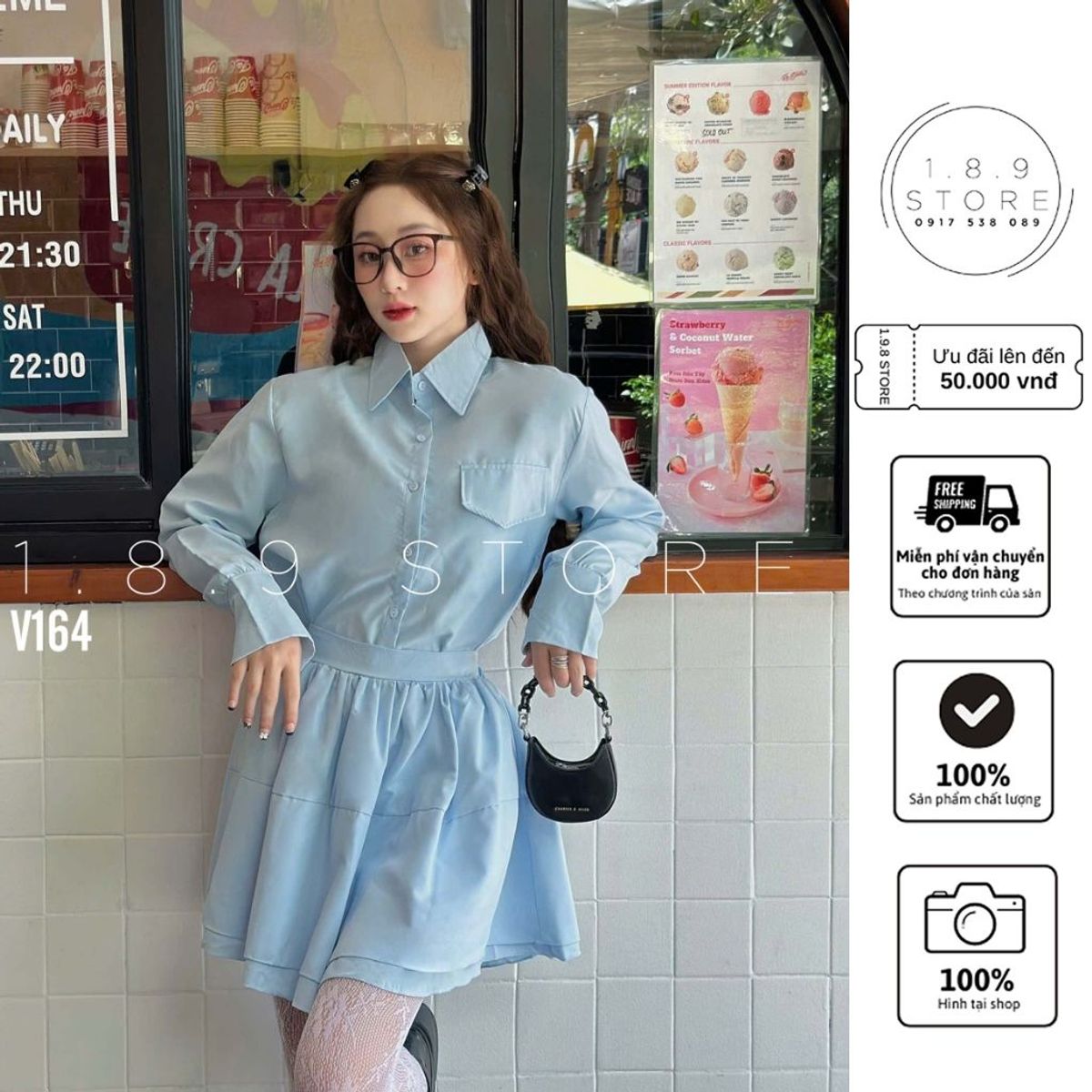 Set đồ nữ sang chảnh tiểu thư áo sơ mi dài tay basic phối chân váy dáng xòe ngắn thiết kế