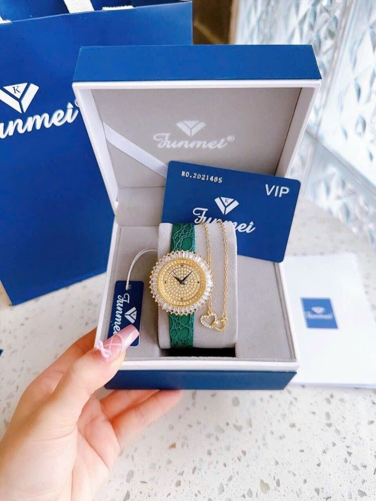 SET ĐỒNG HỒ NỮ CHÍNH HÃNG FUNMEI F2077 MẶT PHA LÊ VÀNG FULLBOX TEM KÈM DÂY CHUYỀN giá sỉ - giá bán buôn
