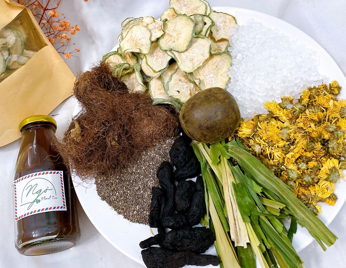 - Set nâng cao: bí đao + thục địa + lá dứa + hạt chia + la hán quả + râu bắp + bông cúc + đường phèn