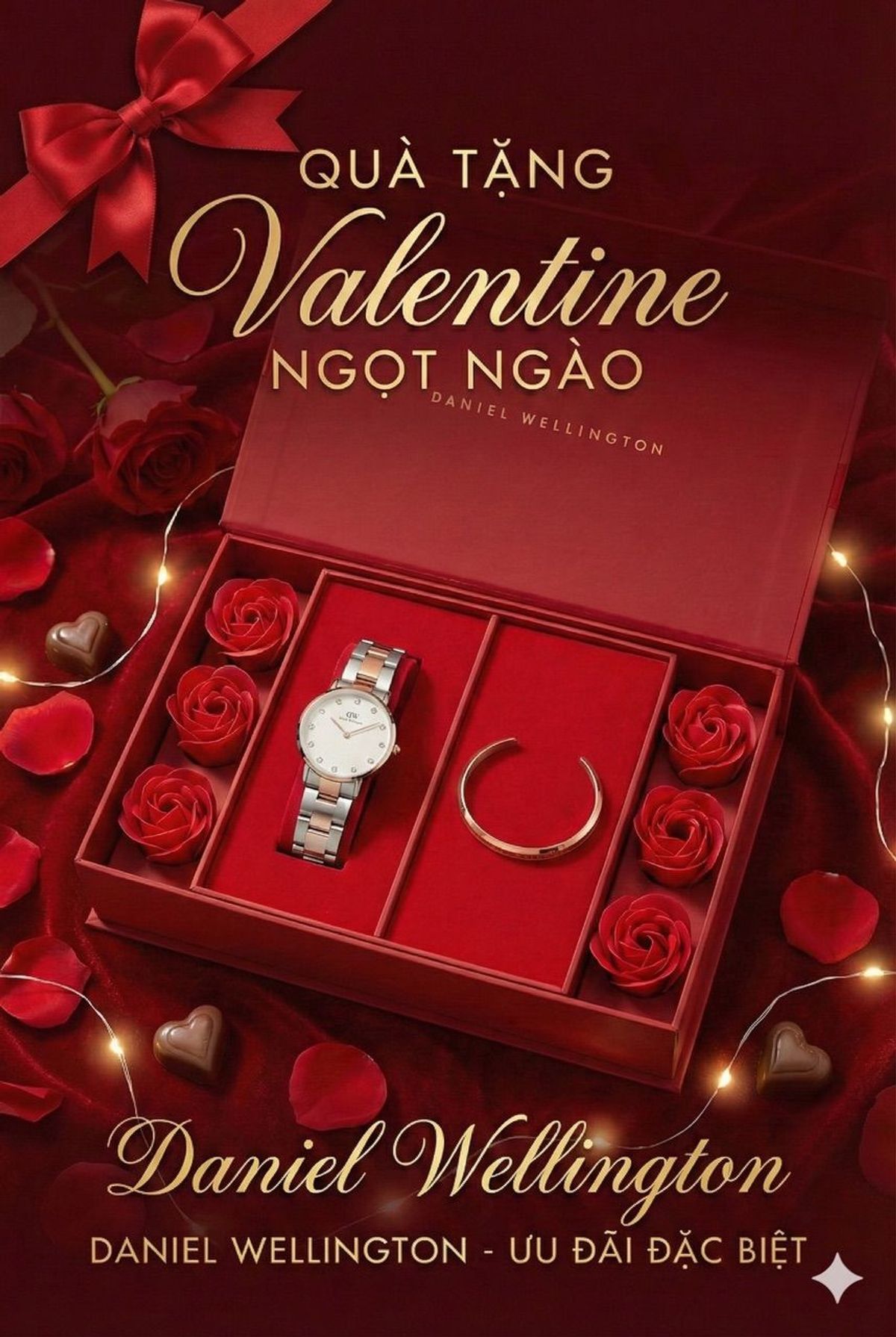 SET VALENTINE DANIEL W CAO CẤP HỘP ĐỎ HOA HỒNG THÉP ICONIC VÀ CUFF