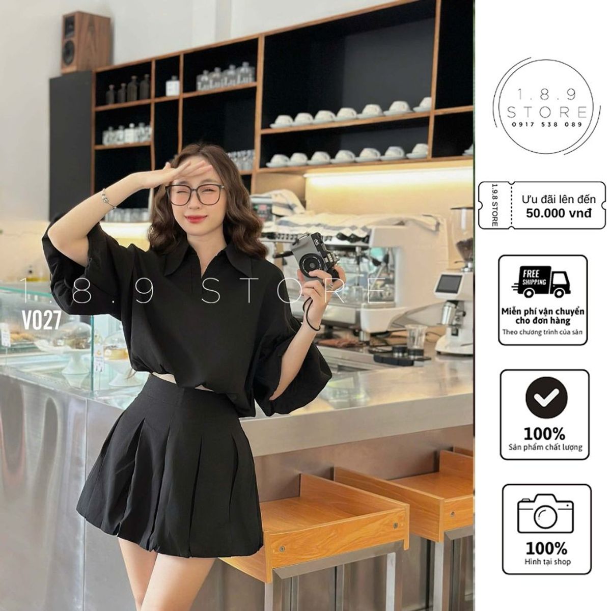Sét Váy Áo Croptop Tay Phồng Chun Cổ Bẻ Mix Chân Váy Bí Phồng Xinh Xắn Chất Vải Xước Thái -V027-189 STORE