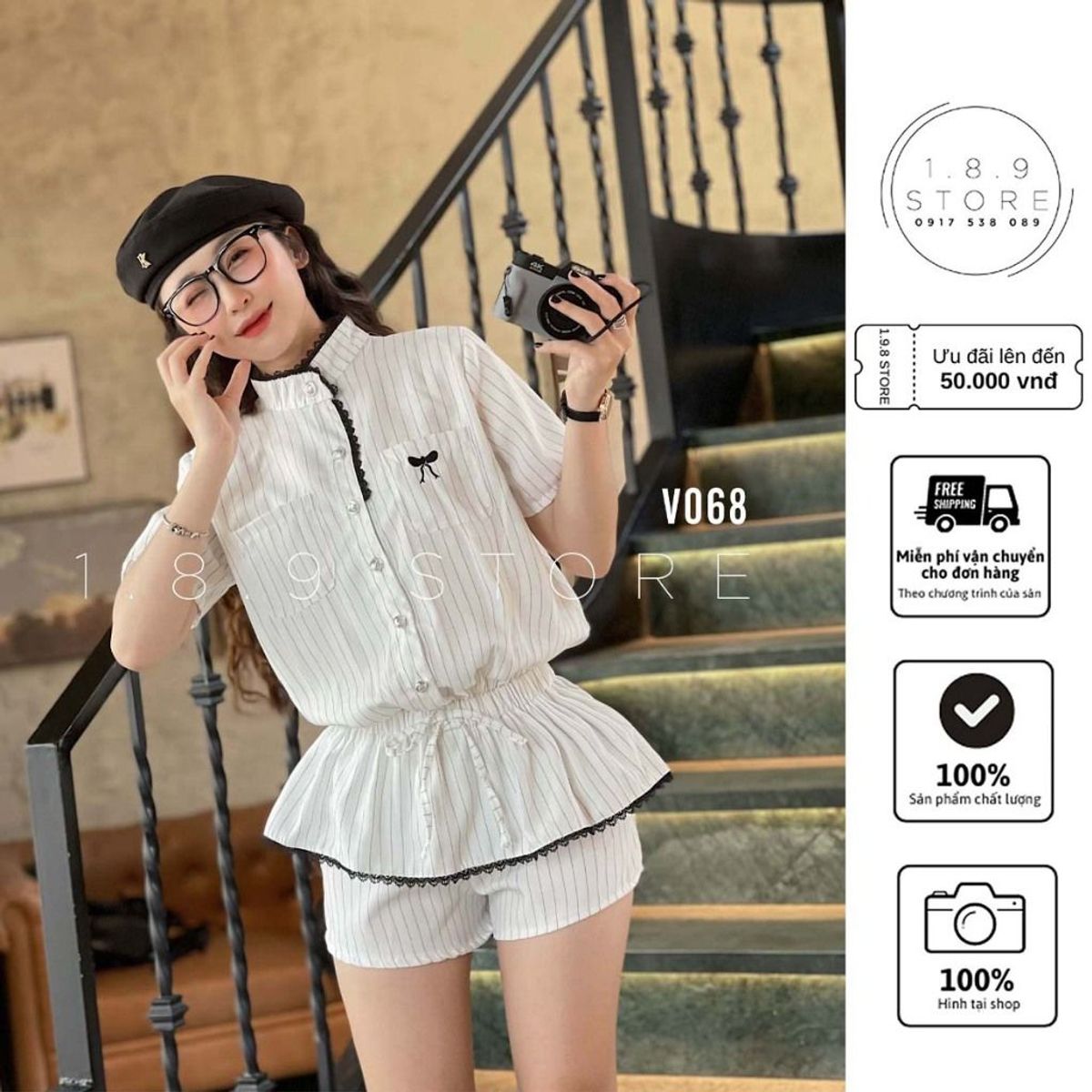 Set Váy Nữ Jumpsuit Cổ Tàu Phối Ren Viền Cổ Thêu Nơ Phong Cách Tiểu Thư