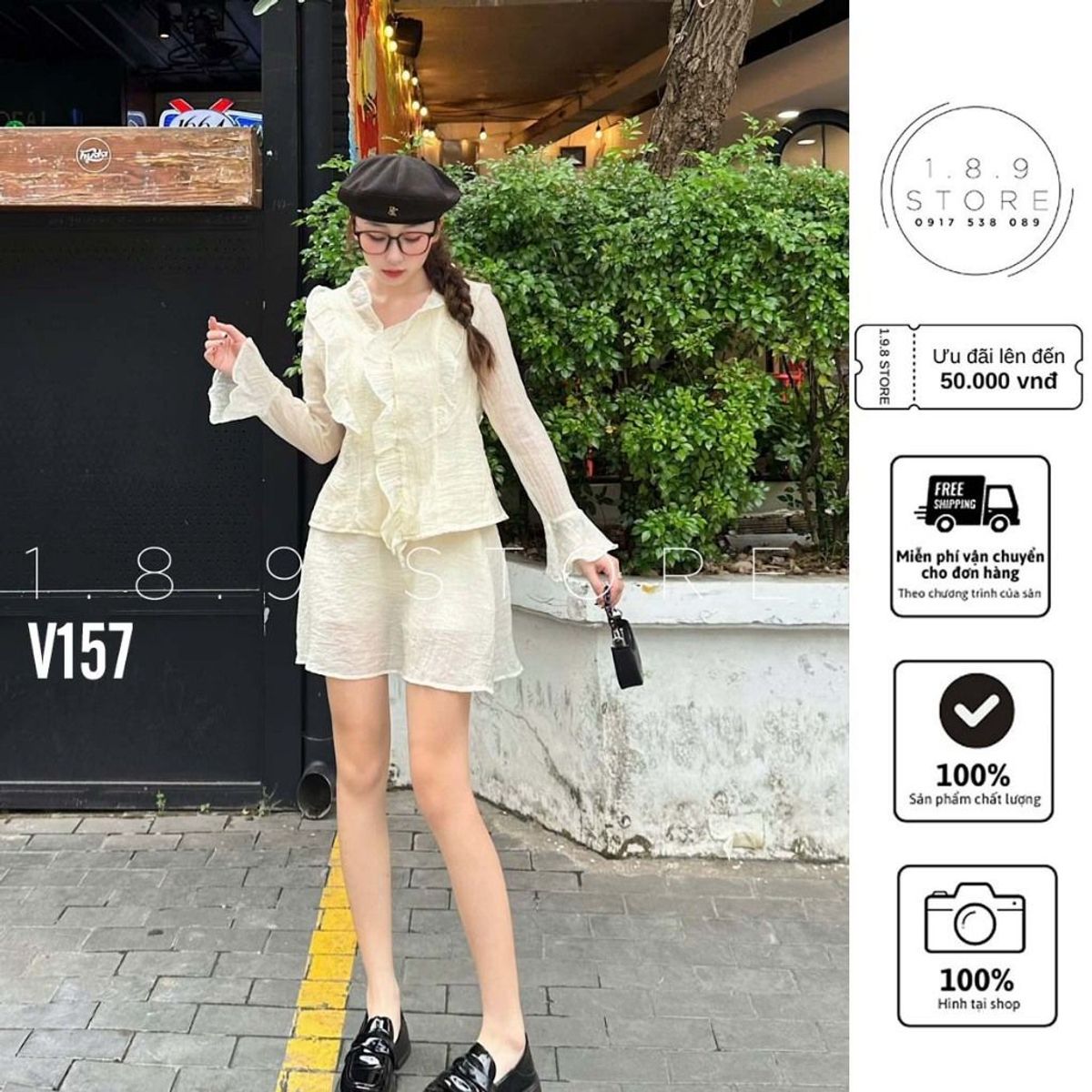 Set váy thiết kế tiểu thư chất voan tơ gãy mềm mịn cổ V tay dài phối bèo sóng chân xòe