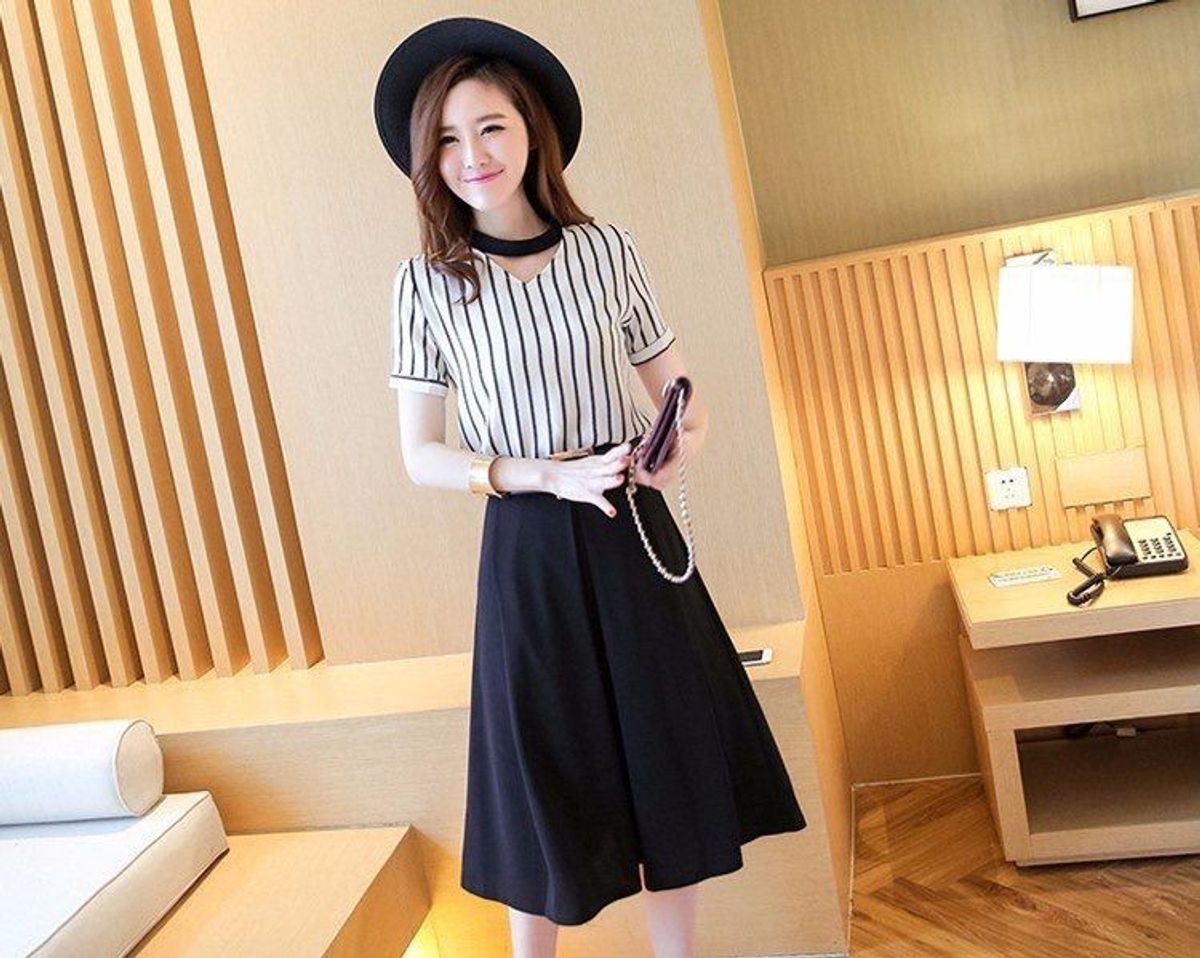 Kiểu dáng: áo tay ngắn, cổ tròn khoét tam giác, dây kéo áo sau lưng, quần lửng ống rộng giả váy, dây kéo quần bên hông, ko kèm nịt