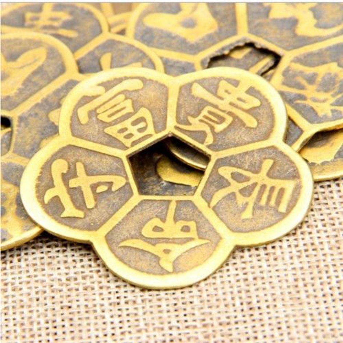 Đồng Tiền Hoa Mai 5 CÁNH PHONG THỦY “Hoa Mai Kim Tiền” có công dụng rất phổ biến là giải tr.ừ tiểu nhân, tránh thị phi. Ngoài ra, đồng tiền hoa mai còn mang một số ý nghĩa đặc biệt. “Hoa mai kim tiền” là đồng tiền bằng đồng hình hoa mai năm cánh. Một mặt chạm “Ngũ Tự” gồm : THỌ (sống lâu), MỆNH (số mạng), THỦ (đứng đầu), PHÚ (giàu có) và QUÝ (thăng tiến) trên mỗi cánh hoa. Mặt còn lại chạm hình ĐÀO TIÊN (trường thọ), CHIM KHÁCH (cát tường), THỎI VÀNG (của cải), DƠI (phúc) và TUẦN LỘC (lộc).