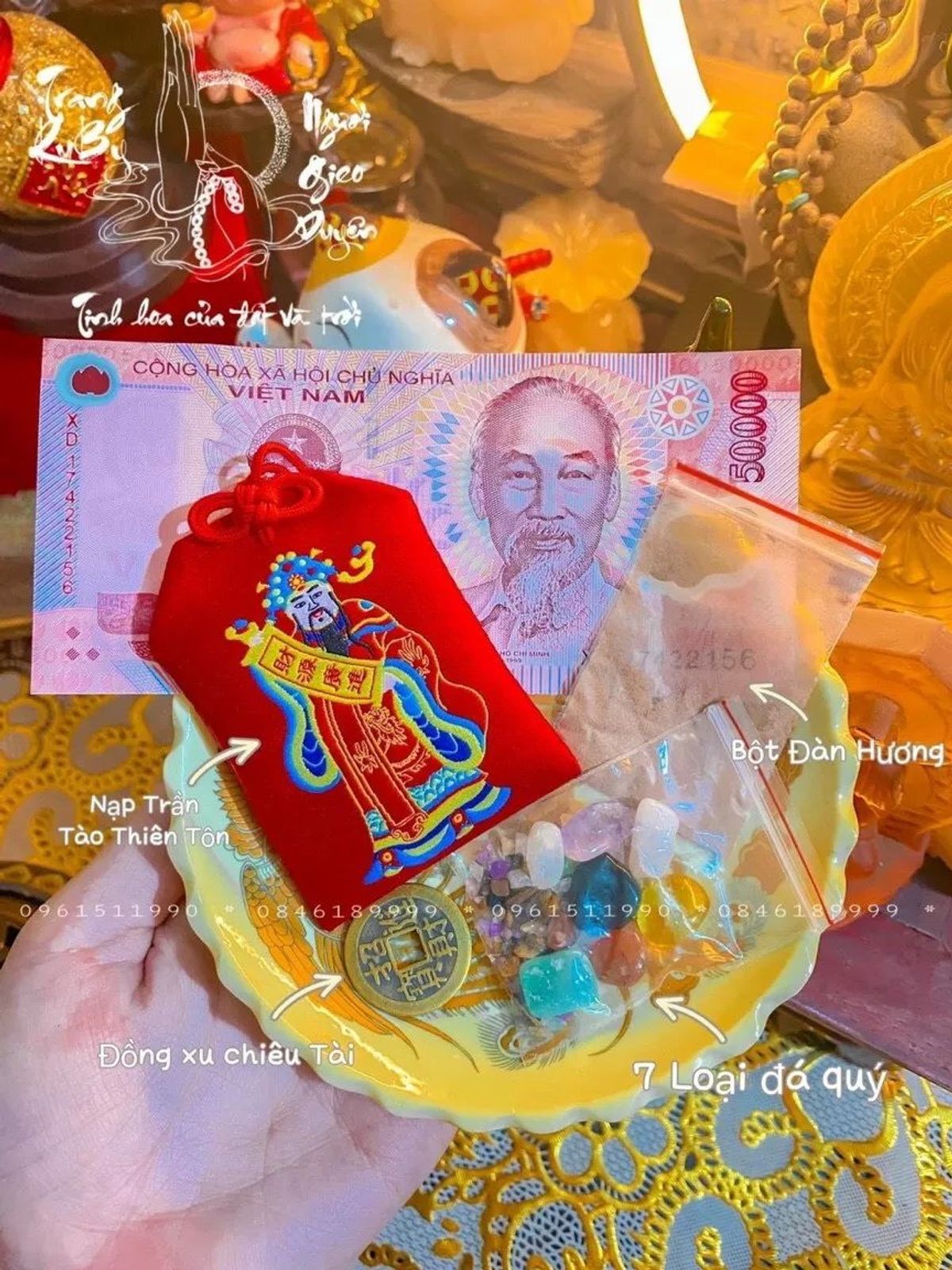 - Túi thần tài gồm : đồng xu may mắn, túi đá thất bảo, túi thêu, lệnh chiêu tài, hộp nhựa mica bên ngoài.